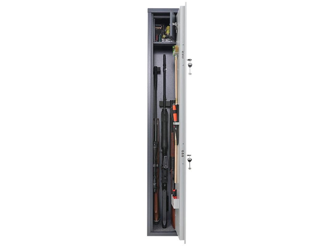 Оружейный сейф AIKO БЕРКУТ 3 предназначен для хранения огнестрельного оружия и патронов к нему. Сейф с толстыми стенками хорошо справляется со своей задачей, толстые стенки позволят ограничить доступ третьих лиц. Толщина металла корпуса и двери увеличена до 2 мм, соответствует всем требованиям Федерального закона «Об оружии». Толстый металл в совокупности с качественным порошковым покрытием позволит защитить сейф от воздействия окружающей среды, а также повысить прочность по отношению к ударам. Покрытие выдерживает самые разные температуры, особенно оно приспособлено к разным перепадам температуры. Максимальная высота ствола 1320 мм. Укомплектован специальным патронным отделением (трейзер), служащим для хранения патронов, документов особой важности и ценных вещей. Нейтральный цвет сейфа «Графит структурированный». Анкерные отверстия для крепления сейфа к стене. Есть возможность поставить ложементы для ружья (сами ложементы на магните, покупаются отдельно). Внутри сейфа установлен дополнительный отдел, который запирается на отдельный замок.