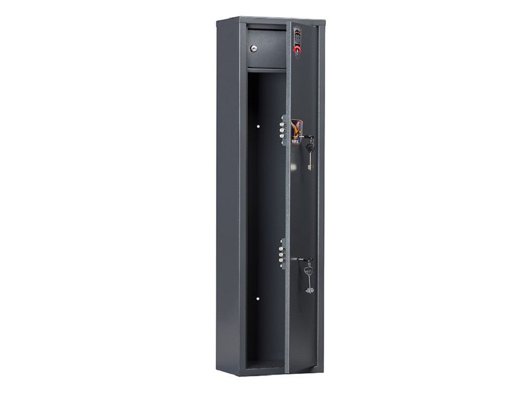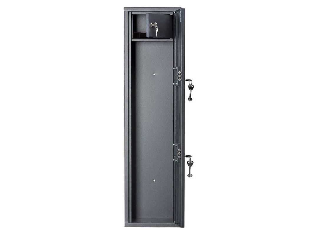 Предназначен для хранения огнестрельного оружия и патронов к нему. Сейф с толстыми стенками хорошо справляется со своей задачей, толстые стенки позволят ограничить доступ третьих лиц. Соответствует всем требованиям Федерального закона «Об оружии». Толстый металл в совокупности с качественным порошковым покрытием позволит защитить сейф от воздействия окружающей среды, а также повысить прочность по отношению к ударам. Покрытие выдерживает самые разные температуры, особенно оно приспособлено к разным перепадам температуры. Максимальная длина ствола 830 мм. Укомплектован специальным патронным отделением (трейзер), служащим для хранения патронов, документов особой важности и ценных вещей. Нейтральный цвет сейфа «Серый графит». Анкерные отверстия для крепления сейфа к стене. Есть возможность поставить ложементы для ружья (сами ложементы на магните, покупаются отдельно).