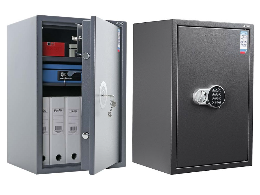 Мебельный сейф AIKO TSN 65T для хранения ценностей и личного оружия. Серия Aiko TSN — одни из самых популярных мебельных сейфов, позволяет ограничить доступ, обезопасить ваши личные вещи или оружие. Данную модель чаще всего выбирают для хранения ценностей в домашних условиях или офисах, недорогие модели, удобные в эксплуатации. Покрыт качественным порошковым покрытием, которое позволит защитить сейф от воздействия окружающей среды. Толстая лицевая панель обеспечит защиту от проникновения. Сейф можно крепить с помощью анкерных болтов (есть соответствующие отверстия). Хоть это и небольшой сейф с недорогой ценой, но в конструкции уже используется качественная сталь с толщиной боковых стенок 1,5 мм и лицевой панели до 2 мм. Отличается габаритами, замок также защищен от высверливания.