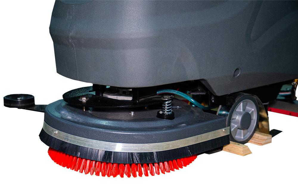 Перед началом работы проверьте уровень заряда аккумулятора и наличие воды в баке. У машины есть система автоматической подачи моющего средства. После включения питания щеточный барабан начинает вращаться, подавая раствор на пол. Щетка вращается быстро, эффективно очищая поверхность от грязи и пятен.
