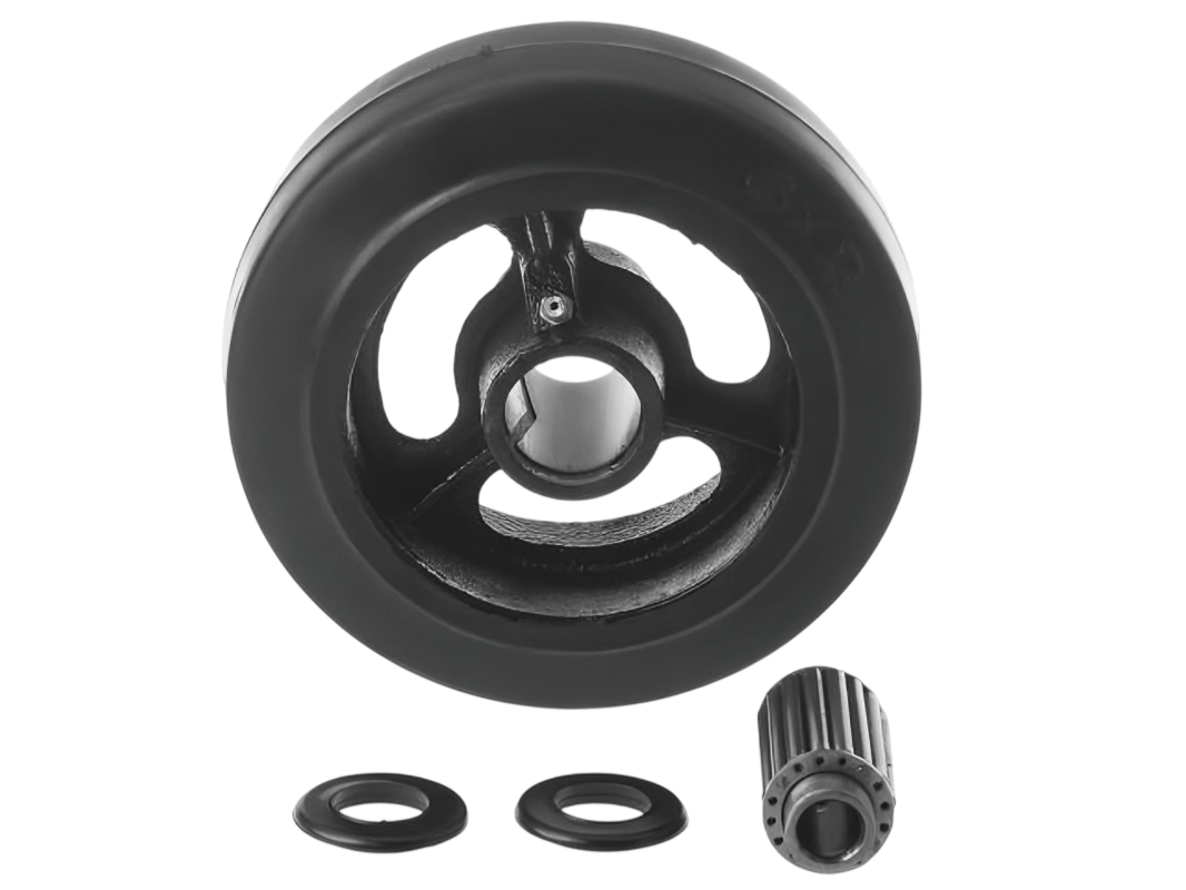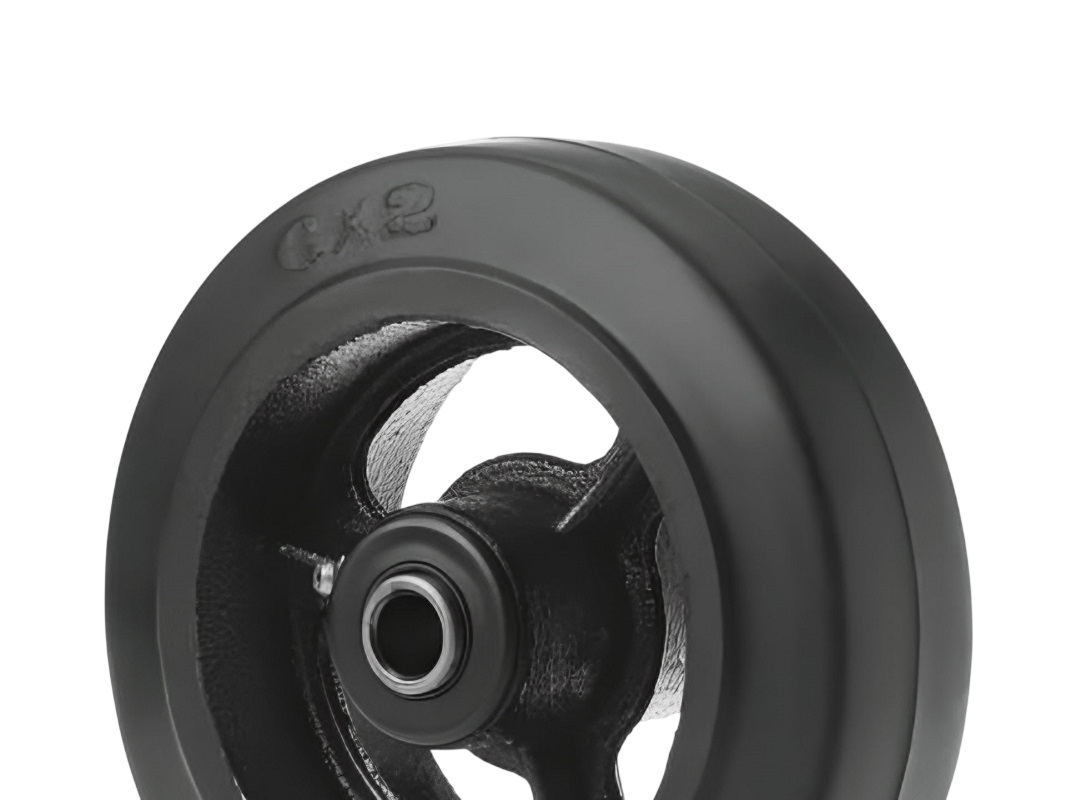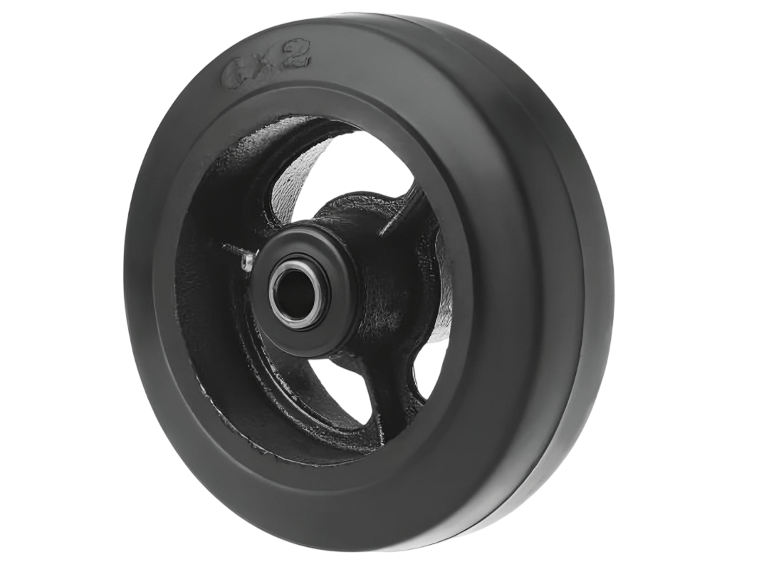 Ступица с роликовым подшипником. Контактная часть выполнена из литой черной резины, которая устойчива к нагрузкам, имеет низкий износ, легко моется водой или мыльным раствором, что позволяет соблюдать санитарно-гигиенические нормы на предприятиях. Чугунные колёсные опоры не желательно использовать на хрупких поверхностях из-за риска повредить пол.