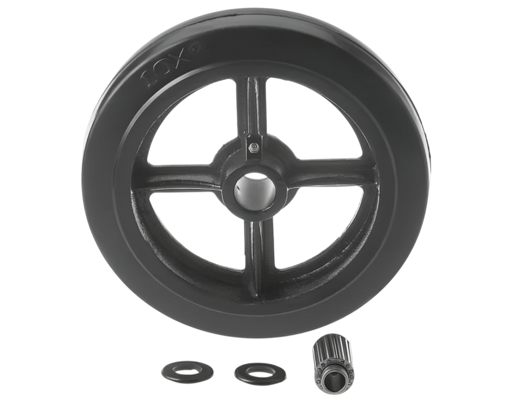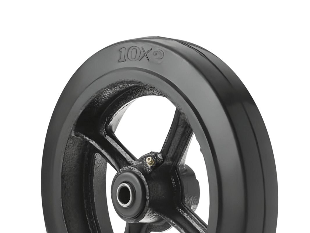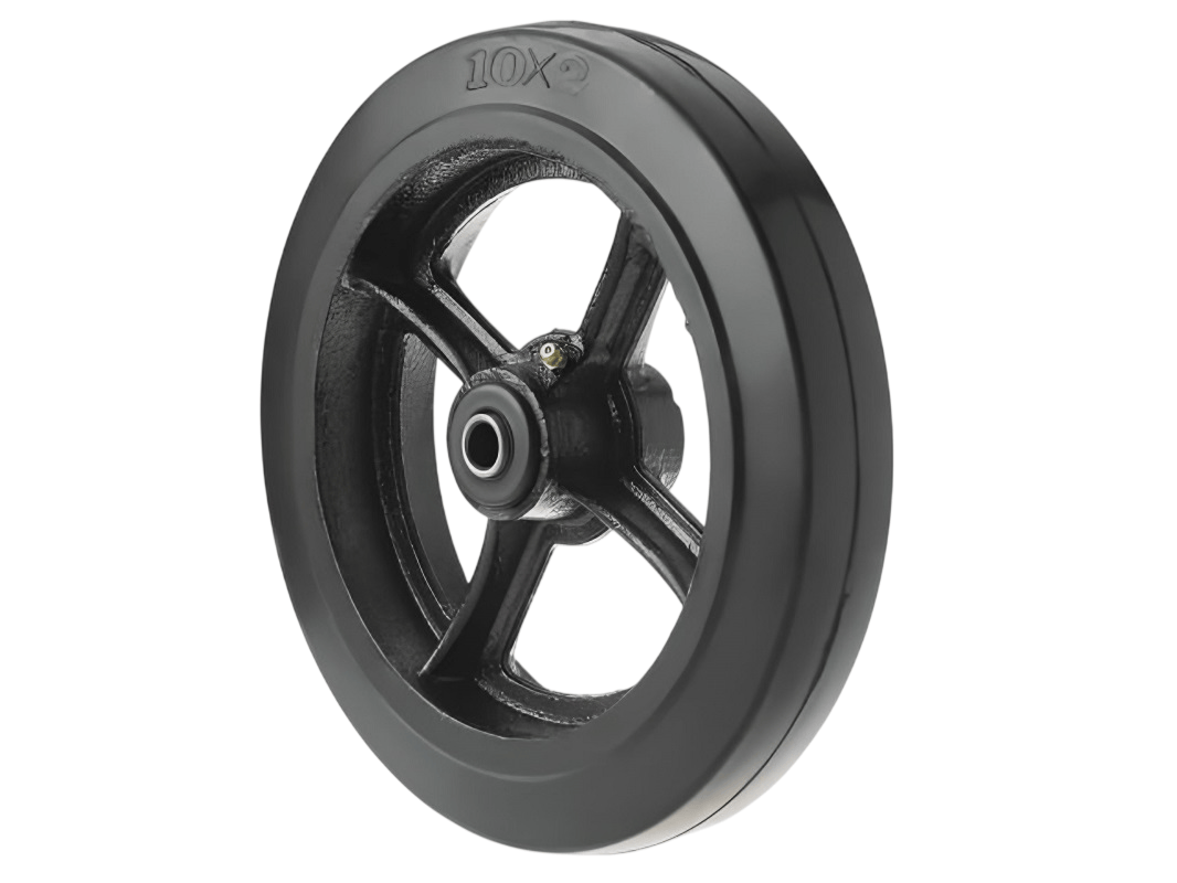 Ступица с роликовым подшипником. Контактная часть выполнена из литой черной резины, которая устойчива к нагрузкам, имеет низкий износ, легко моется водой или мыльным раствором, что позволяет соблюдать санитарно-гигиенические нормы на предприятиях. Чугунные колёсные опоры не желательно использовать на хрупких поверхностях из-за риска повредить пол.