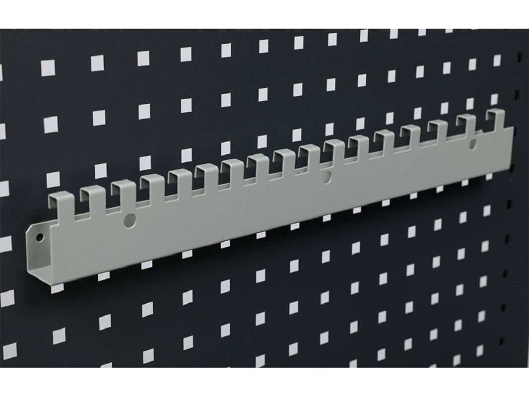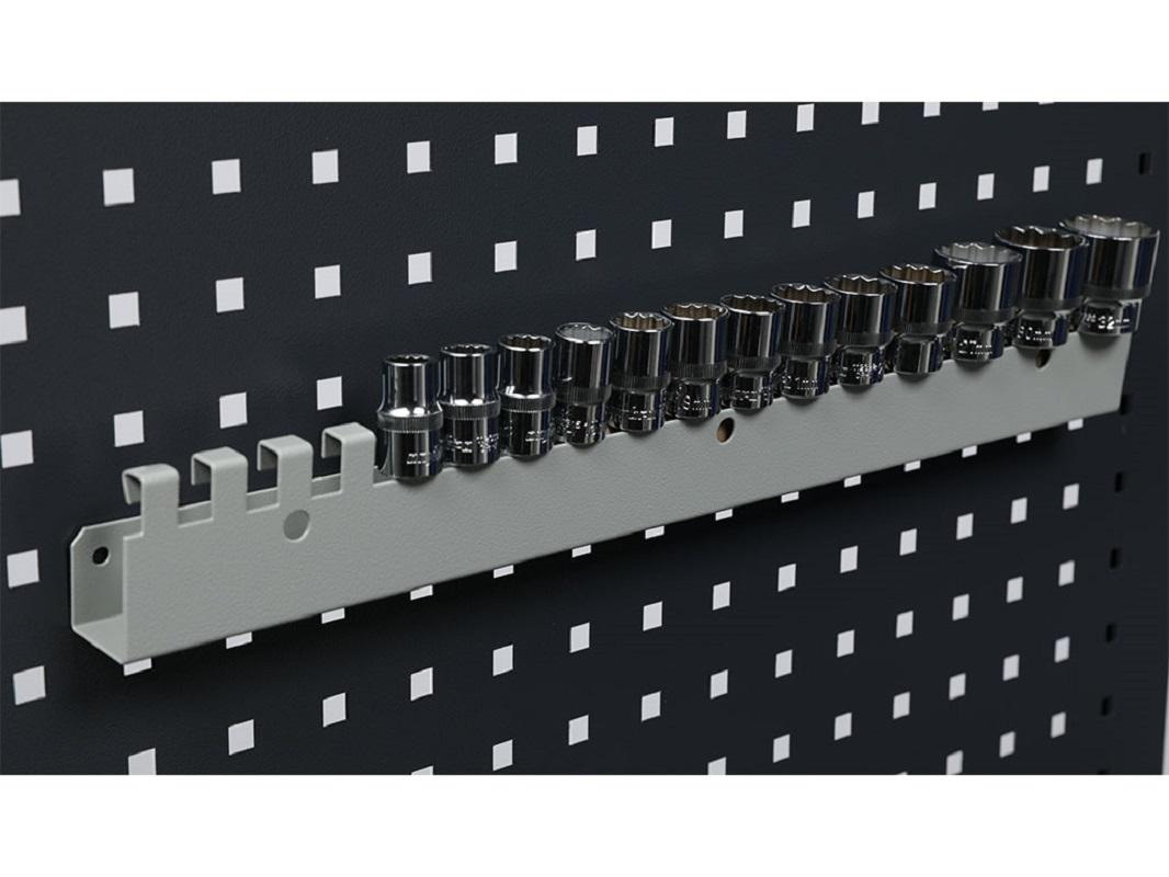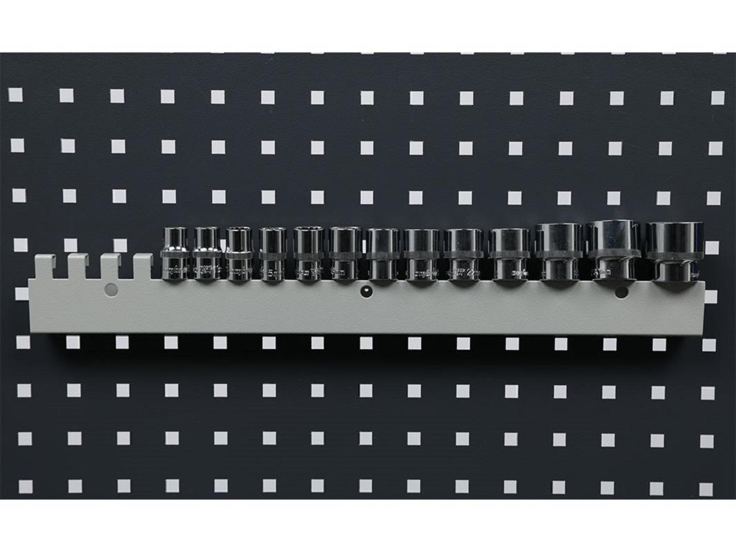 Служит для размещения торцевых головок (17 штук) на перфорированный экран для быстрого доступа к инструменту. Держатель выполнен из качественной стали толщиной 0,7 мм. В случае если держатель сидит не сильно плотно, необходимо поджать язычок для более плотного прилегания к экрану. Подходит практически для всех видов экранов с разной длиной и от разных производителей. Занимает мало места, но при этом каждый размер будет лежать на своем месте.