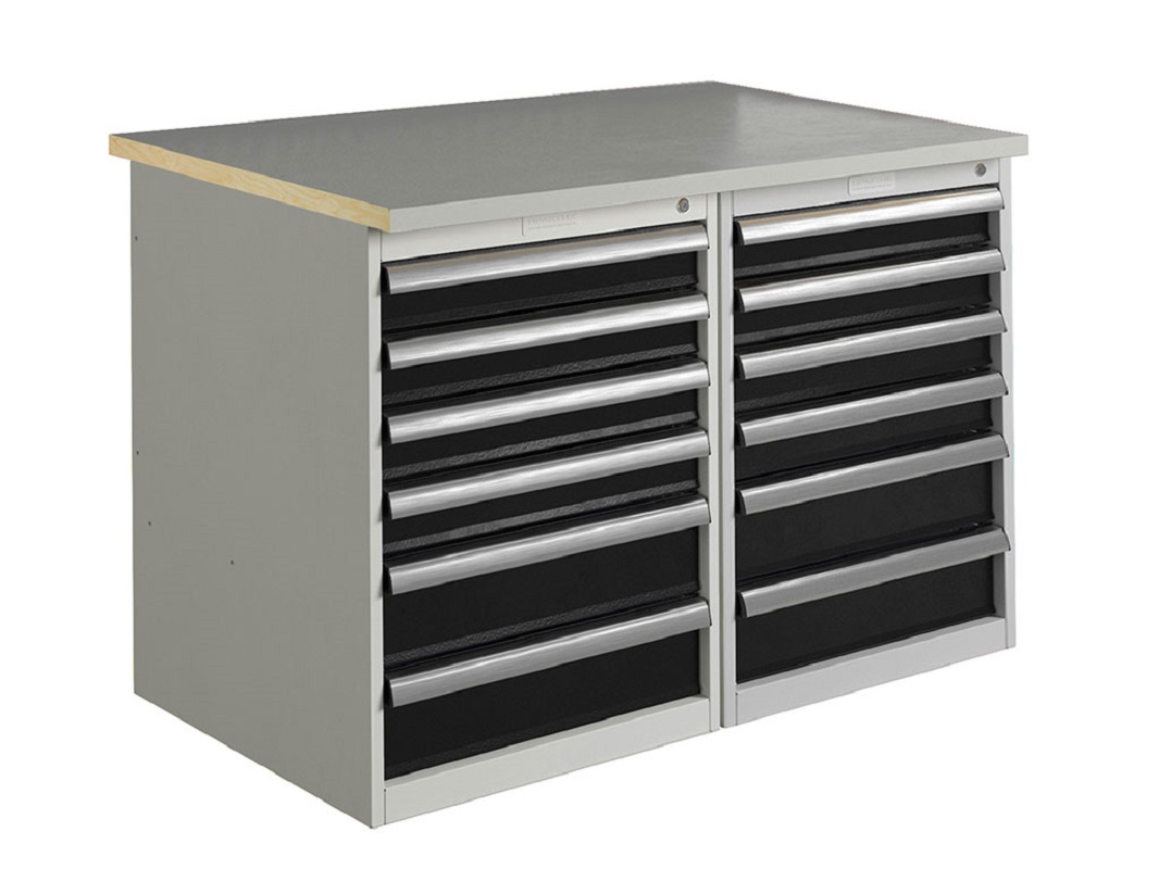 Комплект 2 имеет ширину столешницы 1200 мм с двумя тумбами. В каждую тумбу установлены 6 выдвижных ящиков с нагрузкой до 120 килограмм. В комплекте используется столешница, изготовленная из фанеры толщиной 30 мм, покрытая оцинкованным листовым металлом толщиной 1,5 мм.