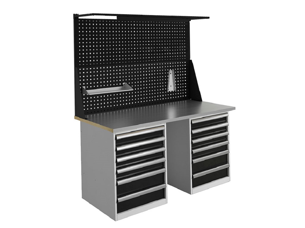 Комплект 9 имеет ширину столешницы 1600 мм с двумя тумбами и перфорированными экранами. В каждую тумбу установлены 6 выдвижных ящиков с нагрузкой до 120 килограмм. В комплекте используется столешница, изготовленная из фанеры толщиной 30 мм, покрытая бесцветным лаком.