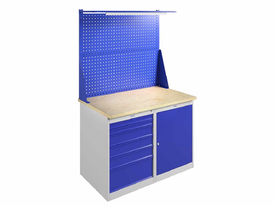 Верстак Практик Expert №206 отличается повышенной устойчивостью, способен выдерживать большие нагрузки до 2000 килограмм. В отличие от серии верстаков PROFI тут используется более толстая столешница в 30 мм. Предлагаем дополнить столешницу накладкой из оцинкованного листа металла толщиной 1,5 мм или окрашенного листа металла толщиной 3 мм. Вся производственная мебель поставляется в разобранном виде. Оказываем услуги по установке и сборке любых видов верстаков, шкафов, стеллажей и т.д. Из-за двух тумб верстак очень надежно стоит на месте, предназначен для организации работы в промышленных сферах деятельности. Возможно установить ящик подвесной для дополнительного хранения.