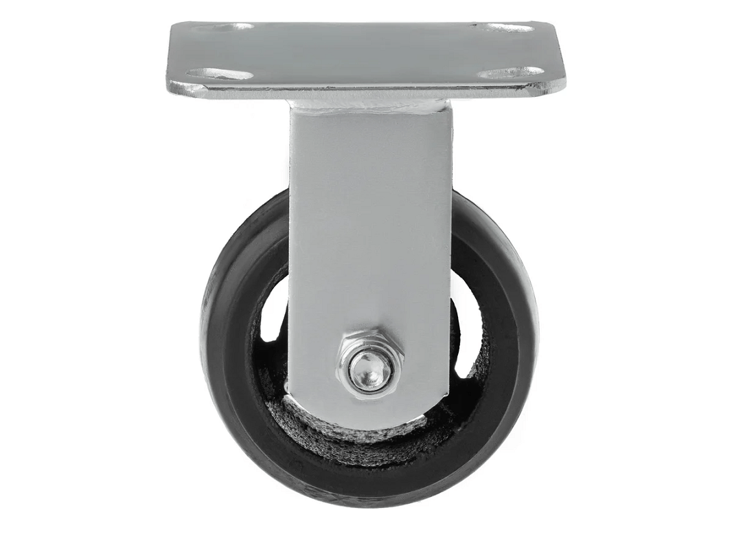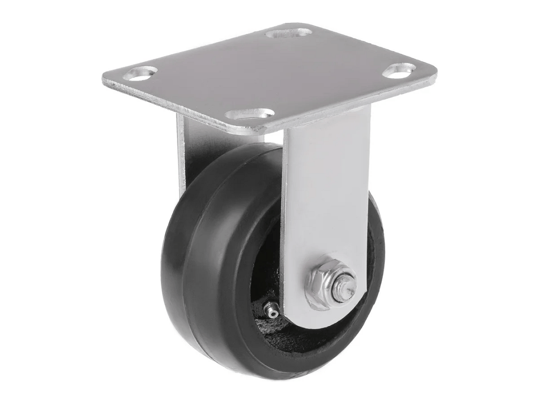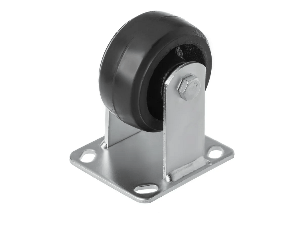 Колесо чугунное большегрузное с неповоротной площадкой и литым резиновым слоем FCd 46 (100 мм/130 кг) крепится на платформе с помощью четырёх болтов. Они не имеют возможности поворачиваться. Эти колеса относятся к категории термостойких, что позволяет им выдерживать температуру до +50°C и повышенную влажность.