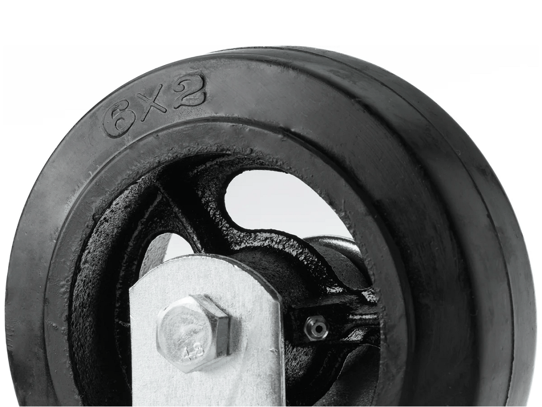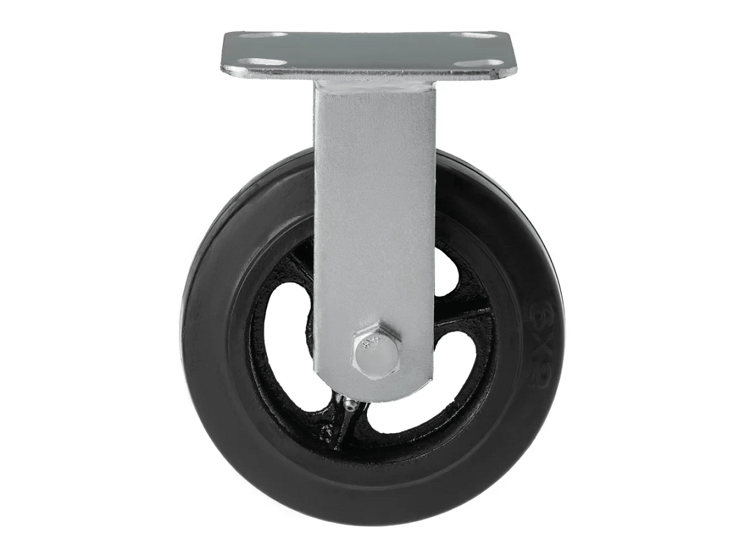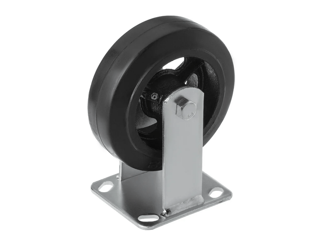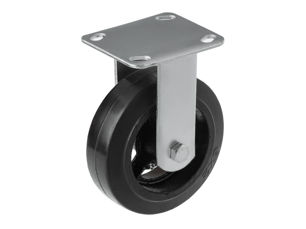 Колесо чугунное большегрузное с неповоротной площадкой и литым резиновым слоем FCd 63 (150 мм/230 кг) крепится на платформе с помощью четырёх болтов. Они не имеют возможности поворачиваться. Эти колеса относятся к категории термостойких, что позволяет им выдерживать температуру до +50°C и повышенную влажность.