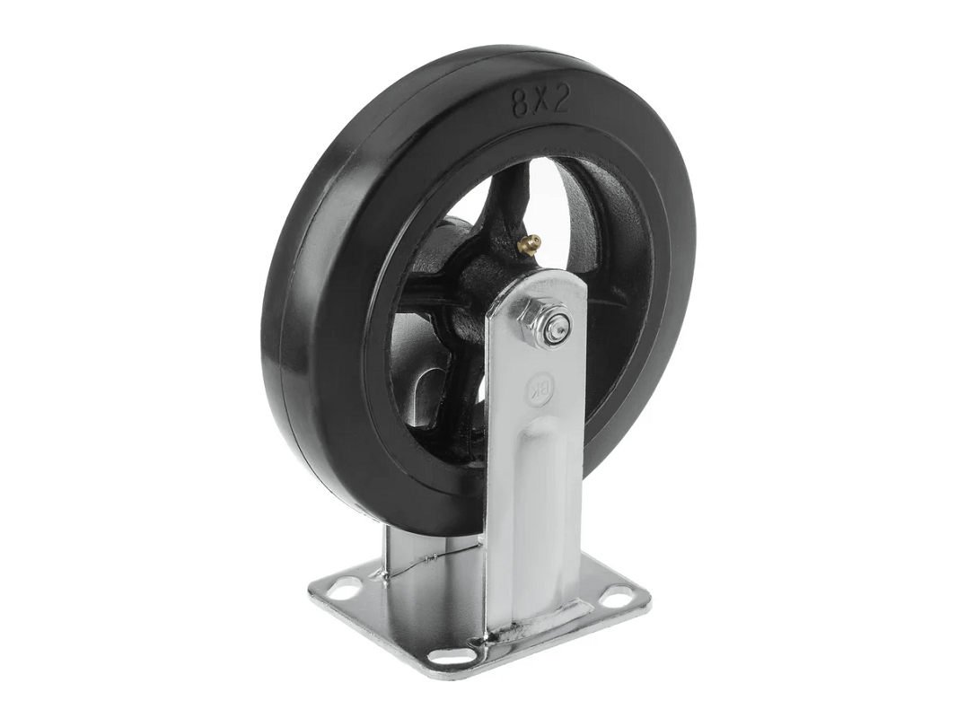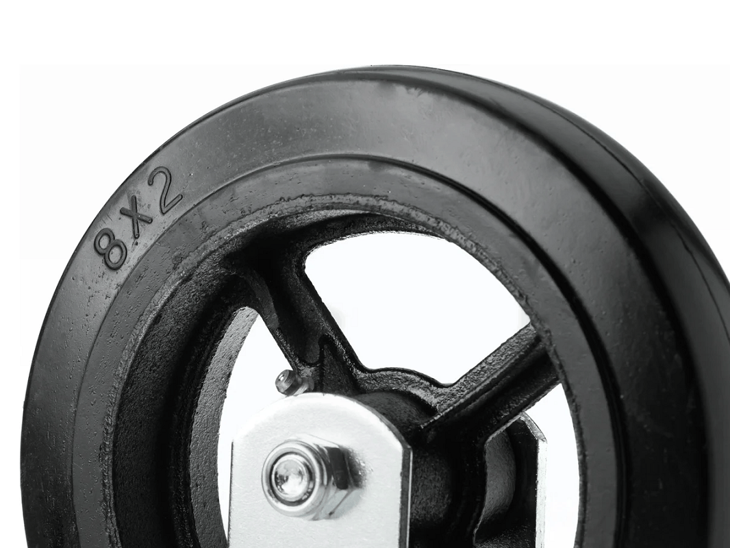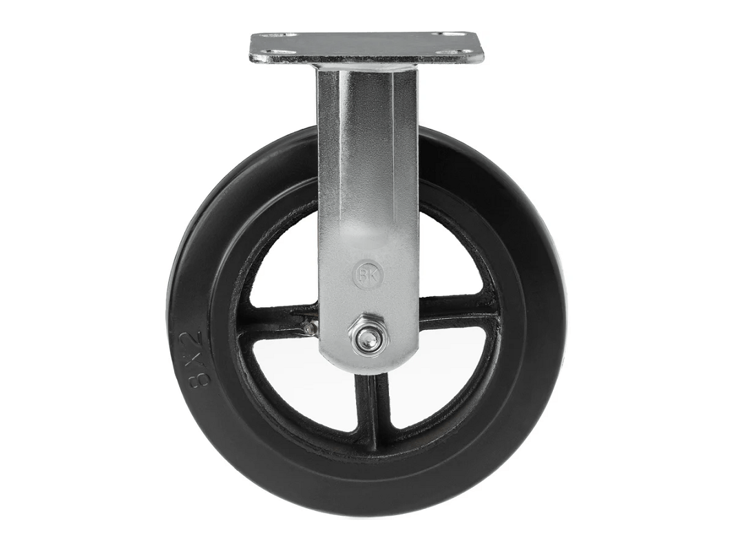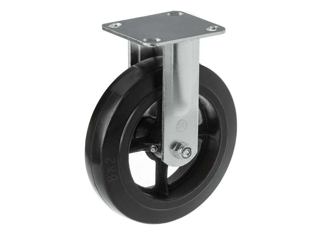 Колесо чугунное большегрузное с неповоротной площадкой и литым резиновым слоем FCD 85 (250 мм/350 кг) крепится на платформе с помощью четырёх болтов. Они не имеют возможности поворачиваться. Эти колеса относятся к категории термостойких, что позволяет им выдерживать температуру до +50°C и повышенную влажность.