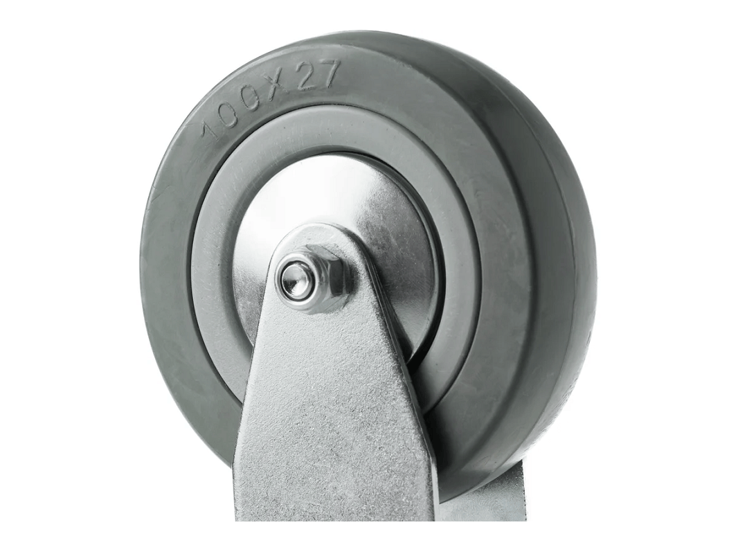 Обод выполнен из полипропилена, который обеспечивает упругость колеса, и закрыт стальными дисками. Ступица с подшипником скольжения и втулкой. Стальной кронштейн устойчив к коррозии. Тип крепления – платформа под 4 болта.