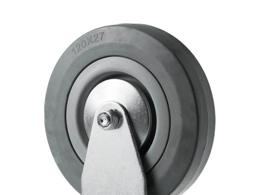 Обод выполнен из полипропилена, который обеспечивает упругость колеса, и закрыт стальными дисками. Ступица с подшипником скольжения и втулкой. Стальной кронштейн устойчив к коррозии. Тип крепления – платформа под 4 болта.