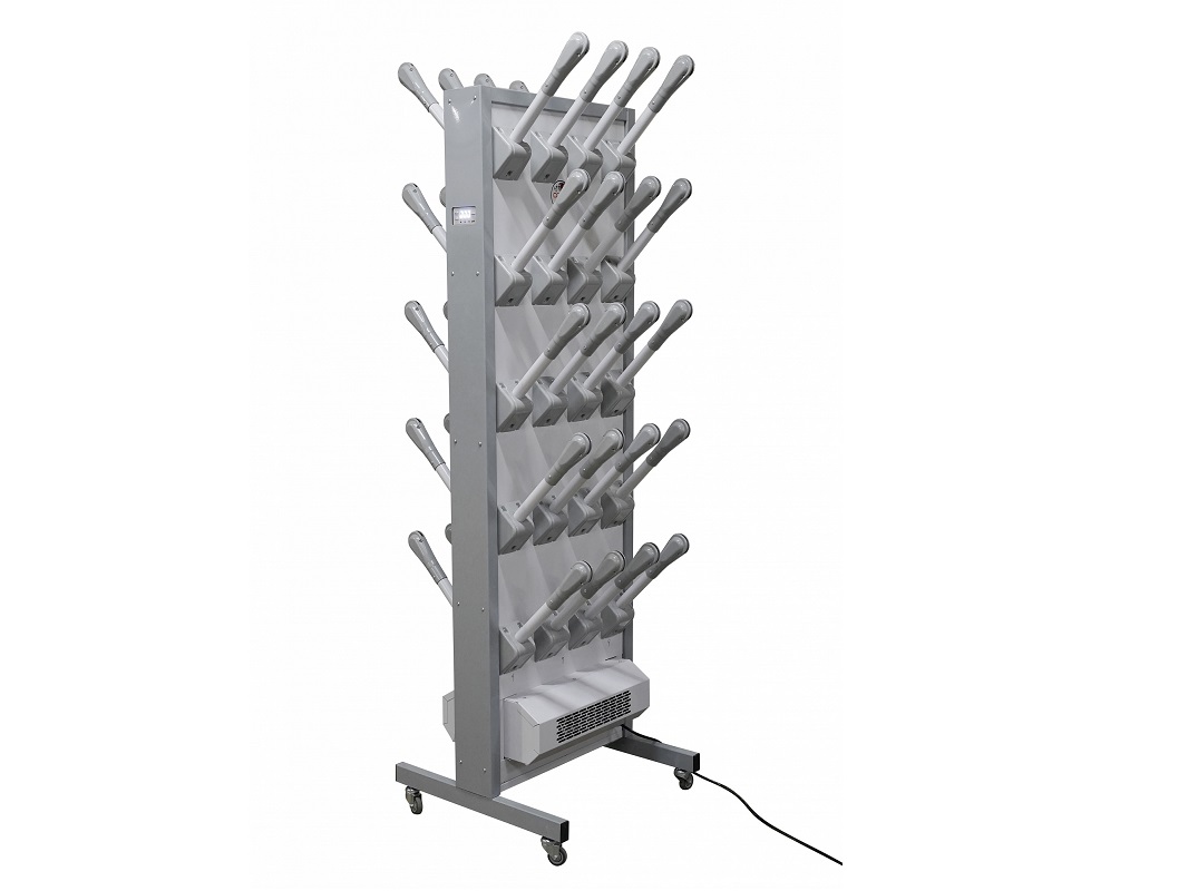 Модульная система — это металлический корпус на сборной подставке с регулируемыми опорами. Она одновременно сушит 20 пар обуви, подавая воздух через специальные трубы. Для обеззараживания в верхней части конструкции установлена бактерицидная лампа.