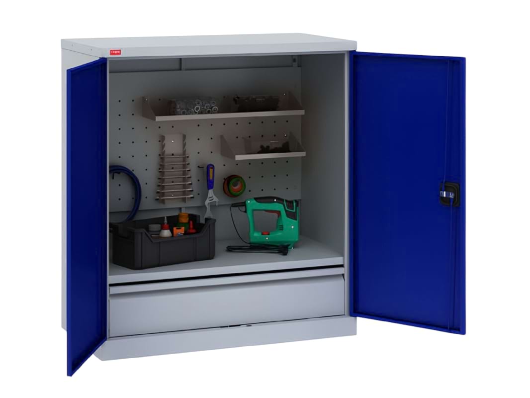 Помогает упорядочить и правильно хранить материалы и предметы. Имеют специальные ящики и крючки для размещения предметов, что обеспечивает безопасное хранение. Конструкция шкафа ограничивает нежелательный контакт с опасными предметами. Вы можете индивидуально смоделировать инструментальный шкаф, выбрав необходимые вам комплектующие и их расположение в шкафу. Износостойкое полимерно-порошковое покрытие позволяет долго сохранять инструментальным шкафам эстетичный внешний вид. Более простая комплектация по сравнению с другими готовыми вариантами.