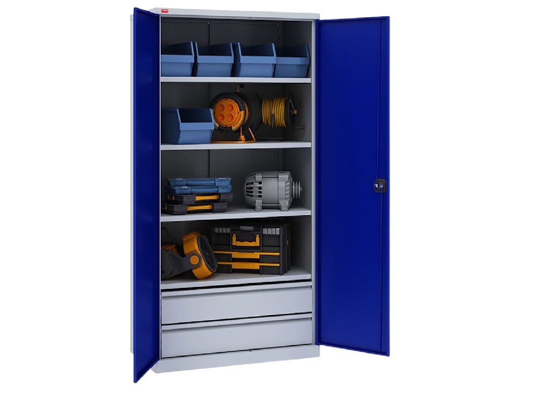 Шкафы имеют специальные ящики и крючки для размещения предметов, что обеспечивает безопасное хранение. Конструкция шкафа ограничивает нежелательный контакт с опасными предметами. Вы можете индивидуально смоделировать инструментальный шкаф, выбрав необходимые вам комплектующие и их расположение в шкафу. Готовый вариант для тех, кто любит больше места, меньше всяких ящиков и полок. Износостойкое полимерно-порошковое покрытие позволяет долго сохранять инструментальным шкафам эстетичный внешний вид.
