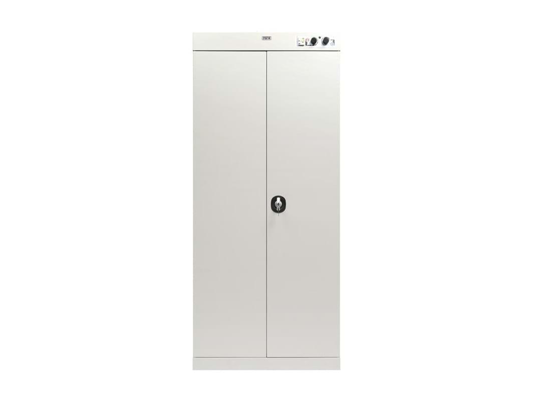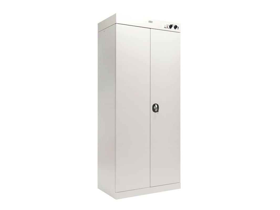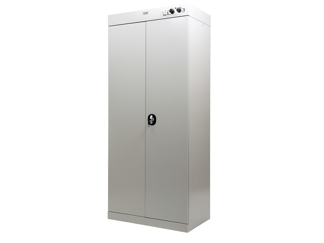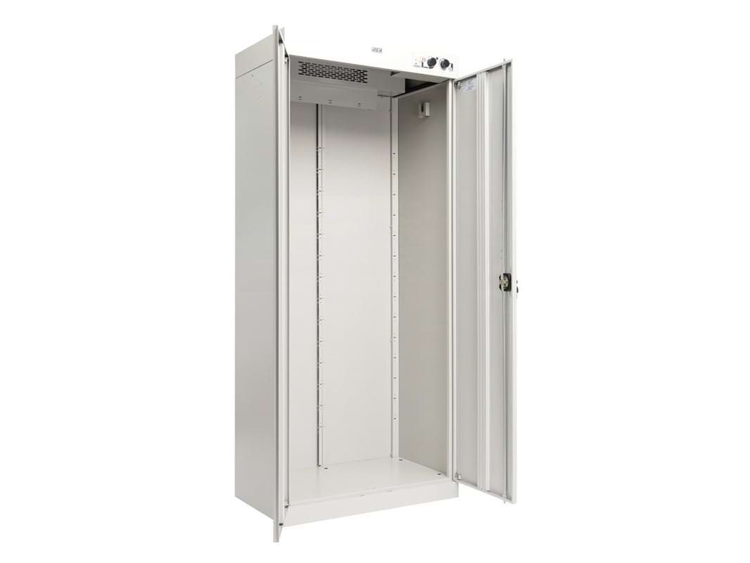 Цельносварная конструкция шкафа обеспечивает жёсткость корпуса. Используется ключевой замок CyberLock CL/3P AM1 556-91 с 2-х сторонней ригельной системой запирания на 2000 комбинаций. За один раз вмещает до 10 комплектов верхней одежды. Правильное размещение нагревательного элемента (в верхней части сушильного шкафа) обеспечит безопасное использование, предотвращает попадания влаги на электрические элементы.