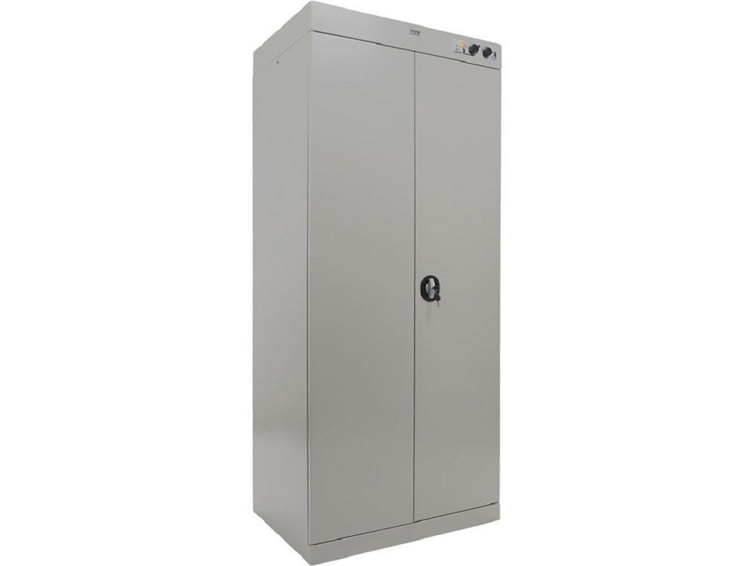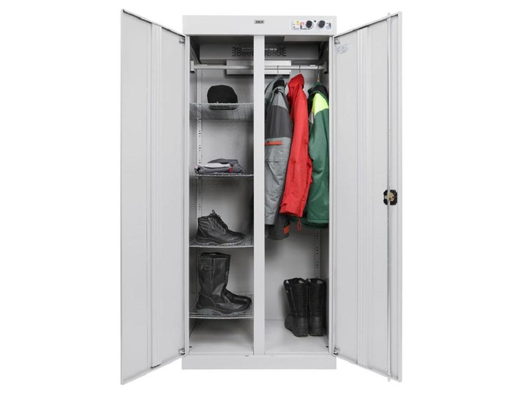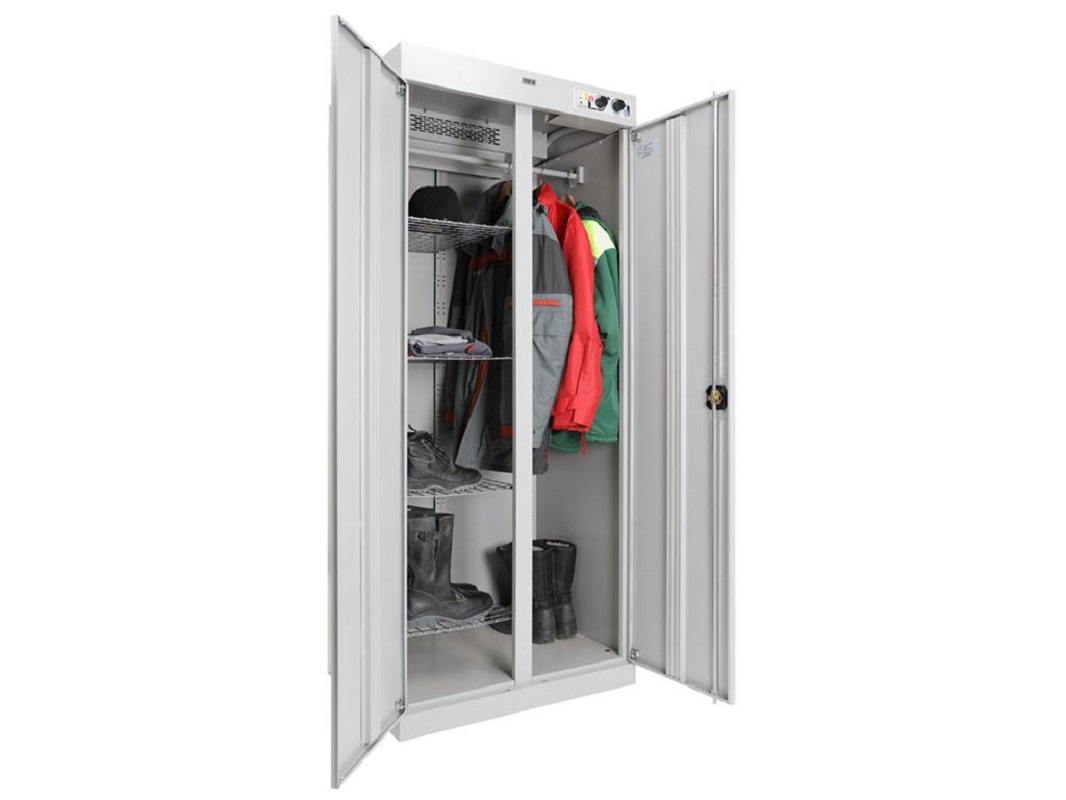 Одновременно шкаф вмещает до 10 комплектов верхней одежды. Нагревательный элемент расположен в верхней части шкафа, что обеспечивает безопасность использования и предотвращает попадание влаги на электрические элементы. Устройство защитного отключения вынесено за пределы корпуса, что дополнительно защищает от возможных неполадок.