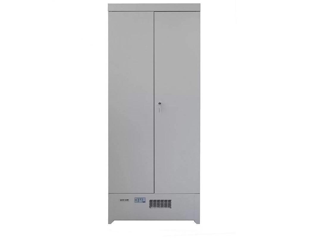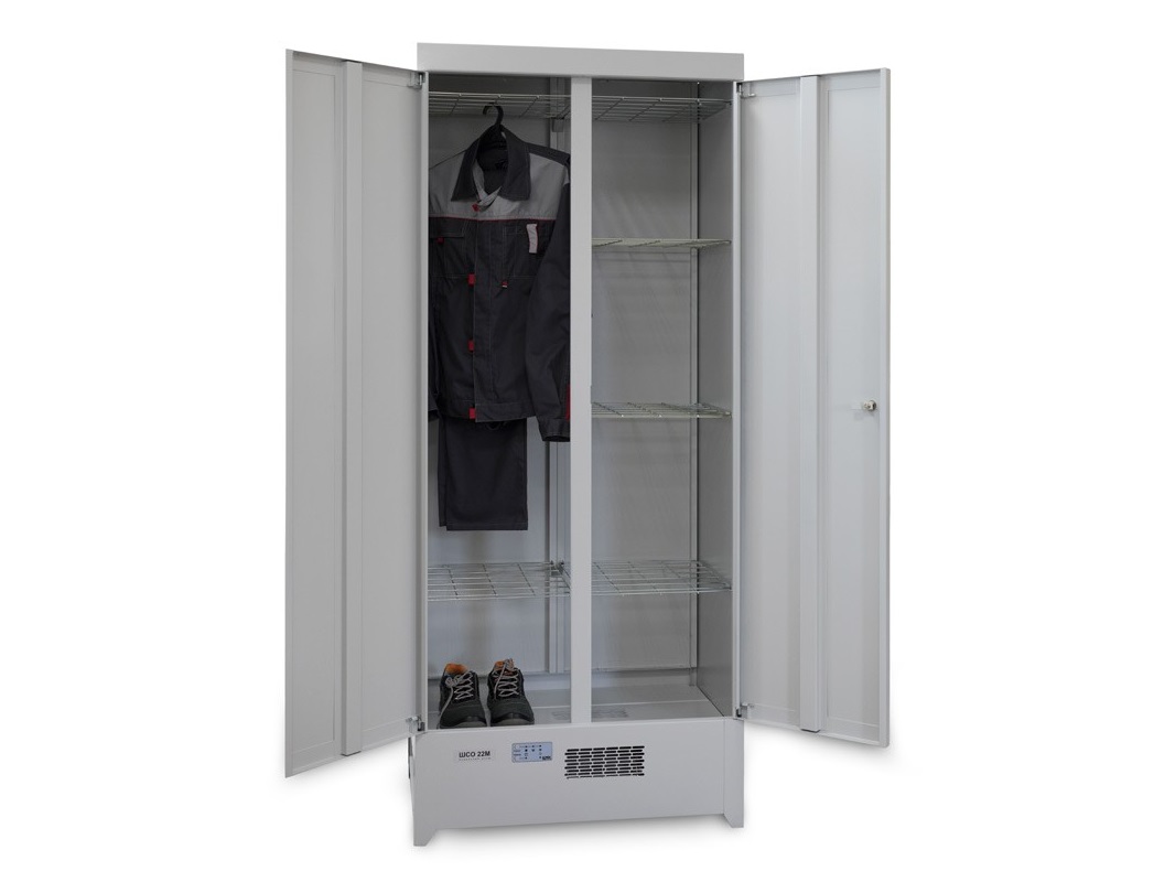 Цельносварная конструкция шкафа обеспечивает жёсткость корпуса. Используется почтовый замок, который сразу запирает две двери. В верхней части шкафа расположено отверстие для выхода воздуха. За один раз вмещает до 10 комплектов верхней одежды. Правильное размещение нагревательного элемента обеспечит безопасное использование, предотвращает попадания влаги на электрические элементы. Устройство защитного отключения вынесено за пределы корпуса. В