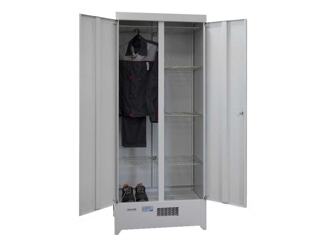 Цельносварная конструкция шкафа обеспечивает жёсткость корпуса. Используется почтовый замок, который сразу запирает две двери. В верхней части шкафа расположено отверстие для выхода воздуха. За один раз вмещает до 10 комплектов верхней одежды.