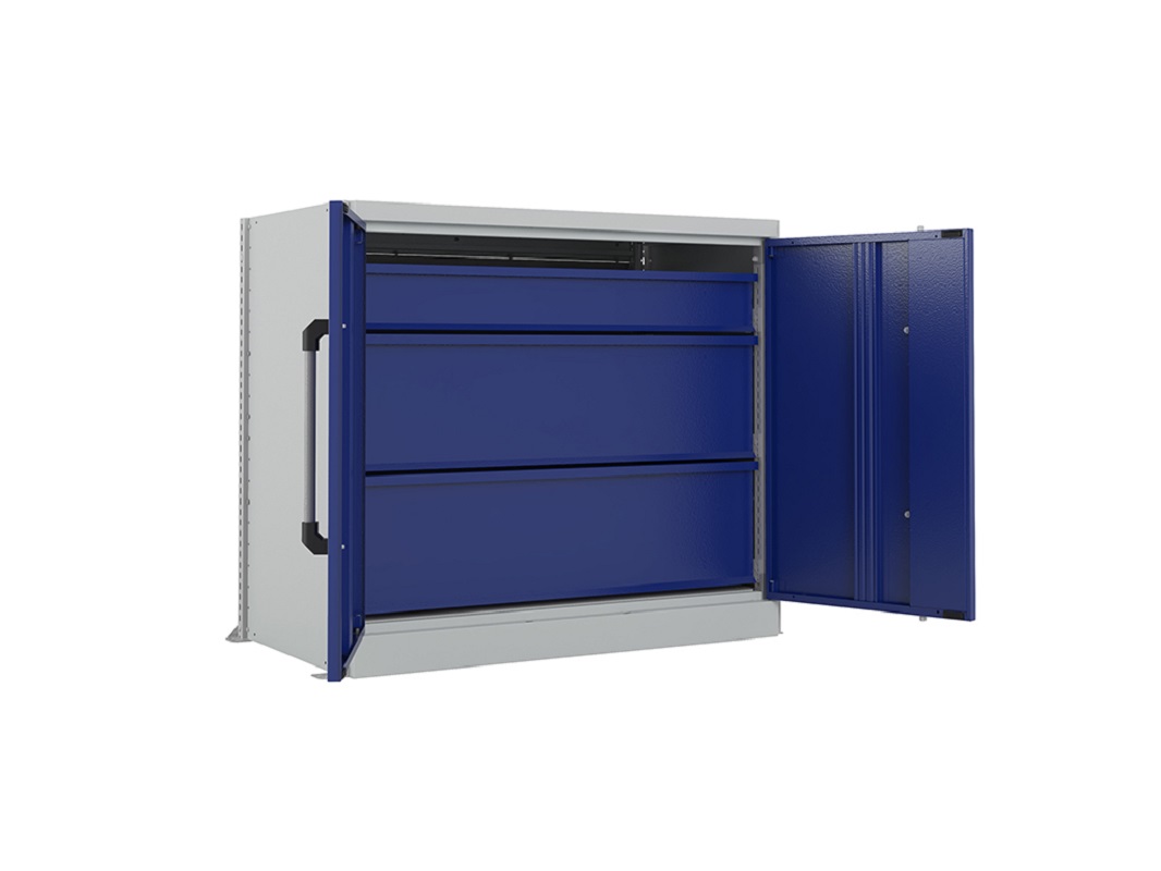 Выдвижной ящик также рассчитан на нагрузку до 95 кг. Помимо него, в шкафу предусмотрен экран для удобного размещения небольших инструментов на специальных держателях. Для еще большего удобства предлагаем оснастить шкаф дополнительными полками и ящиками.