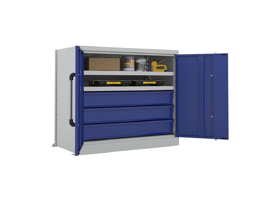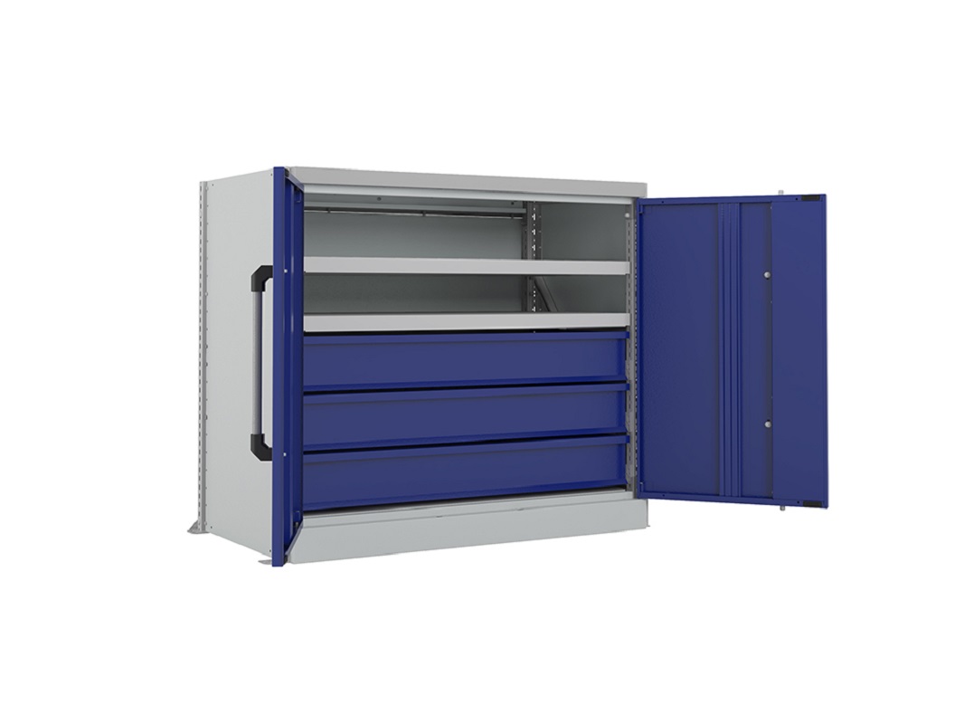 Выдвижной ящик также рассчитан на нагрузку до 95 кг. Помимо него, в шкафу предусмотрен экран для удобного размещения небольших инструментов на специальных держателях. Для еще большего удобства предлагаем оснастить шкаф дополнительными полками и ящиками.