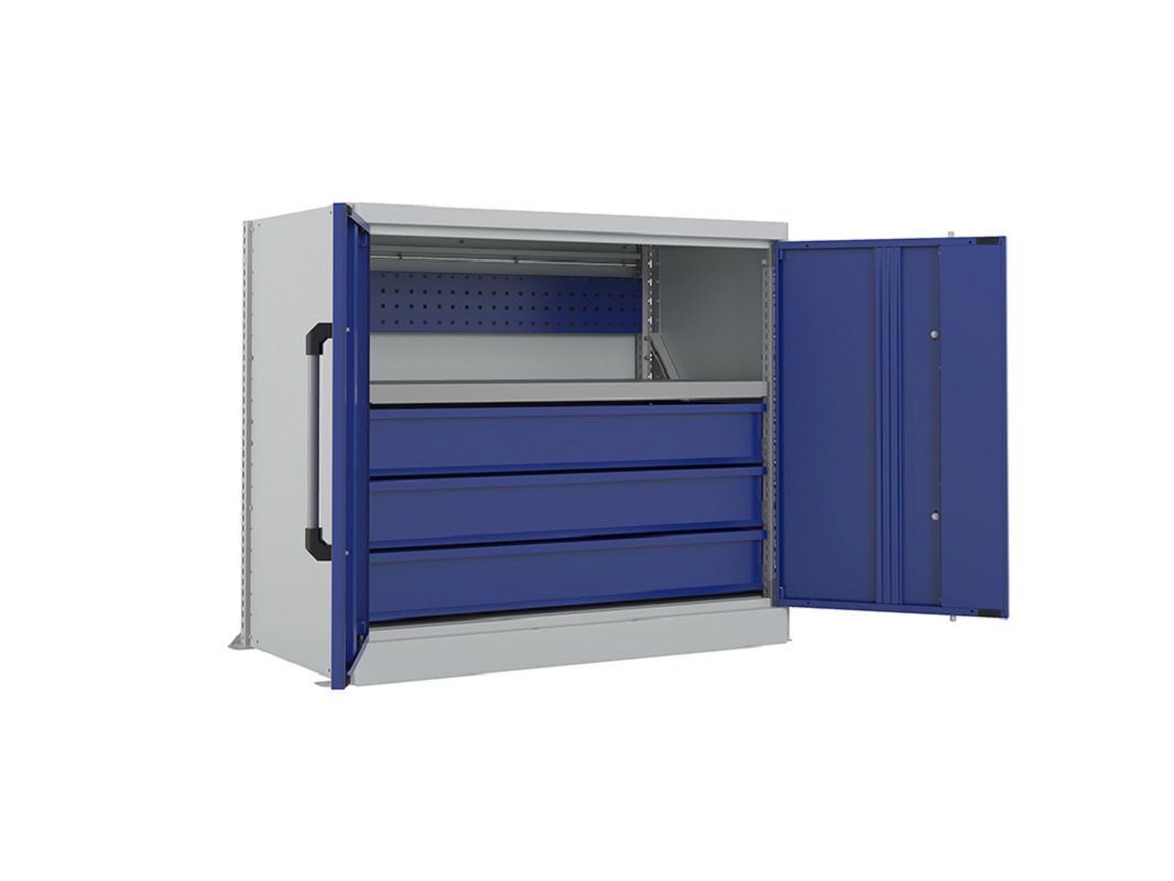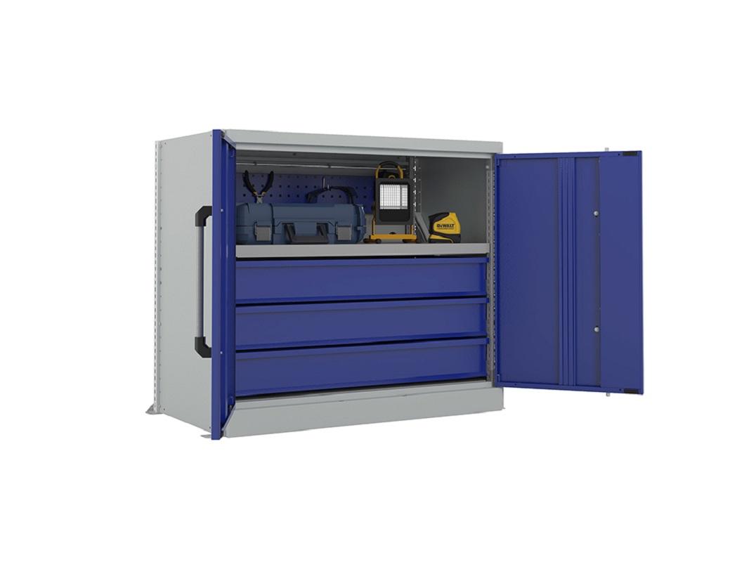 Выдвижной ящик также рассчитан на нагрузку до 95 кг. Помимо него, в шкафу предусмотрен экран для удобного размещения небольших инструментов на специальных держателях. Для еще большего удобства предлагаем оснастить шкаф дополнительными полками и ящиками.