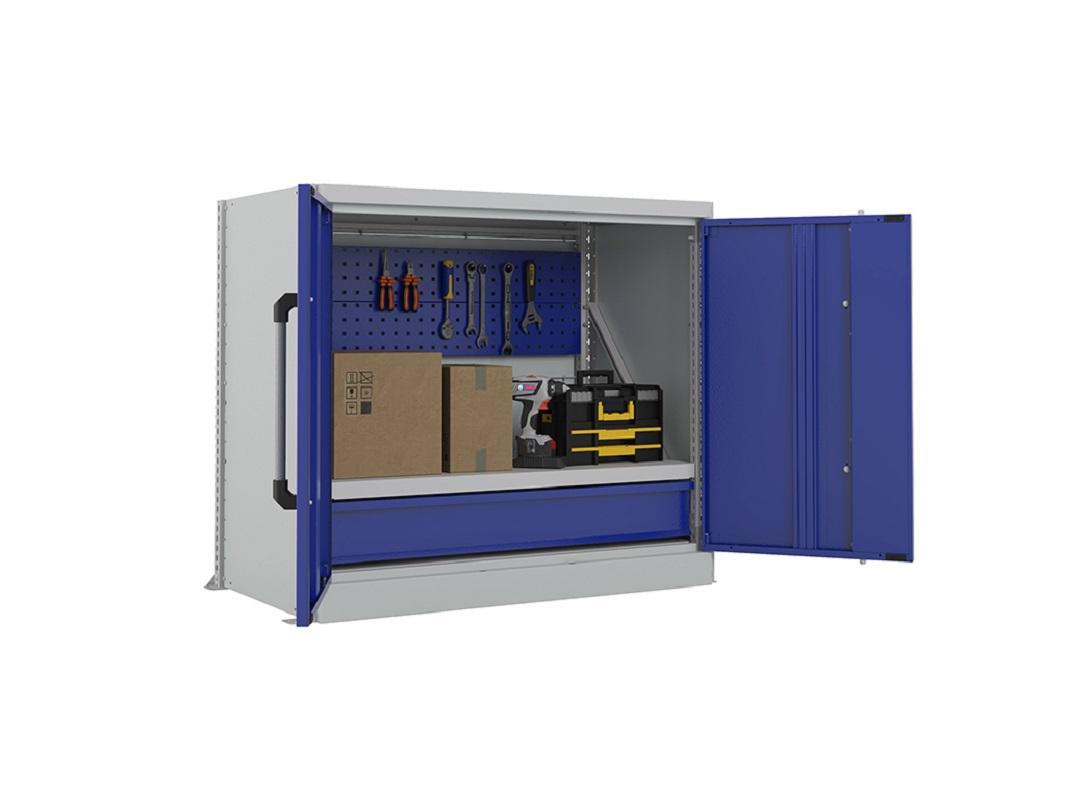 Модульный инструментальный шкаф HARD 1000-021010 предназначен для хранения инструментов, оснастки, тяжелых грузов на производственных площадках. Сама конструкция шкафа состоит из двух рам HARD грузового стеллажа. Дверь изготовлена из толстой стали в 1 мм. В отличие от других шкафов, в этом используется 2-сторонняя ригельная система запирания с ключевым замком Kaba Mauer. Шкаф способен выдержать нагрузки до 1000 килограмм, полка изготовлена из оцинкованной стали толщиной в 1,5 мм с максимальной нагрузкой до 400 килограмм. Выдвижной ящик способен выдерживать нагрузки до 95 килограмм. Помимо выдвижного ящика установлен экран для удобного размещения небольшого инструмента на специальных держателях. Для удобного хранения предлагаем оснастить шкаф дополнительными полками и ящиками.