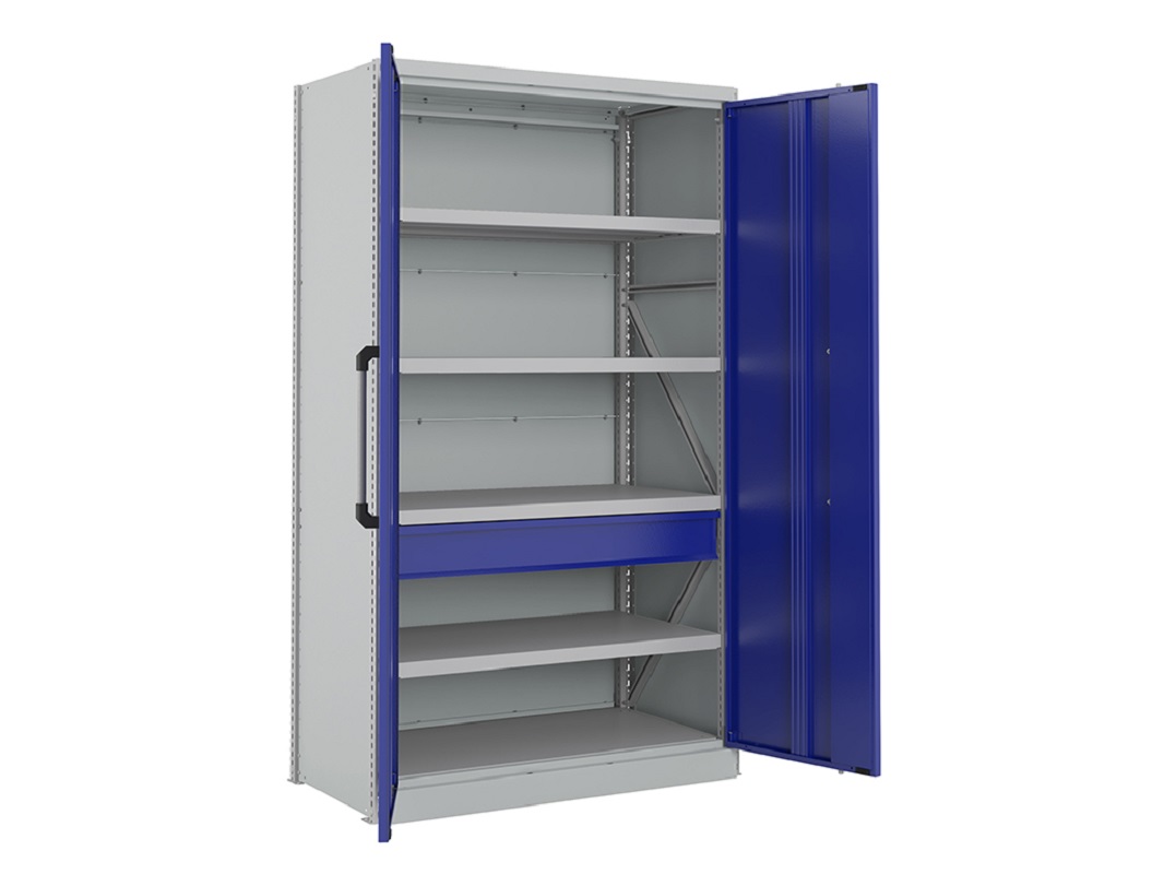 Выдвижной ящик также рассчитан на нагрузку до 95 кг. Помимо него, в шкафу предусмотрен экран для удобного размещения небольших инструментов на специальных держателях. Для еще большего удобства предлагаем оснастить шкаф дополнительными полками и ящиками.