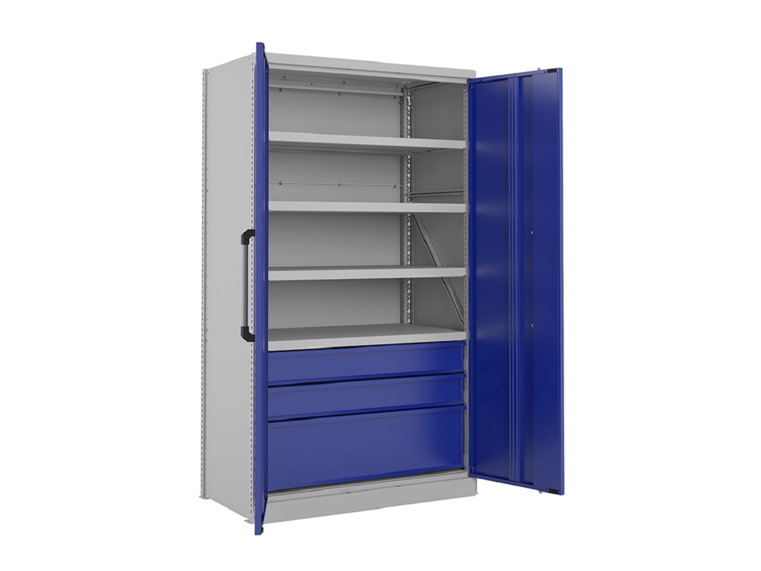Выдвижной ящик также рассчитан на нагрузку до 95 кг. Помимо него, в шкафу предусмотрен экран для удобного размещения небольших инструментов на специальных держателях. Для еще большего удобства предлагаем оснастить шкаф дополнительными полками и ящиками.