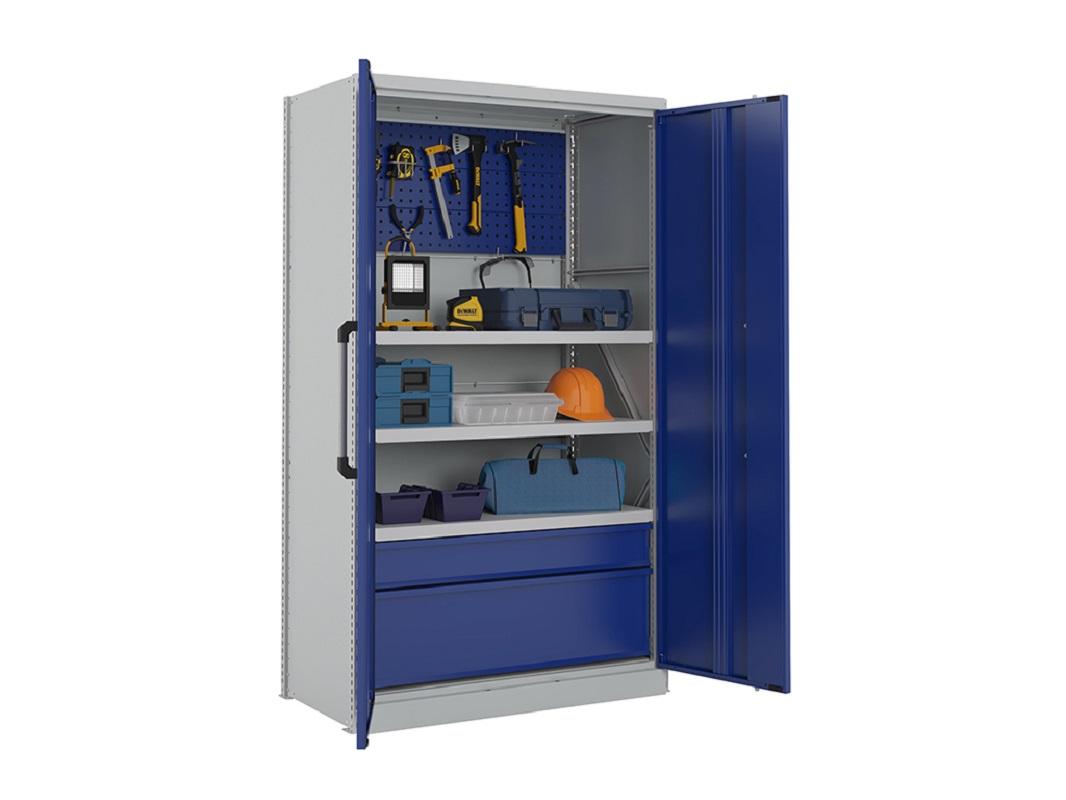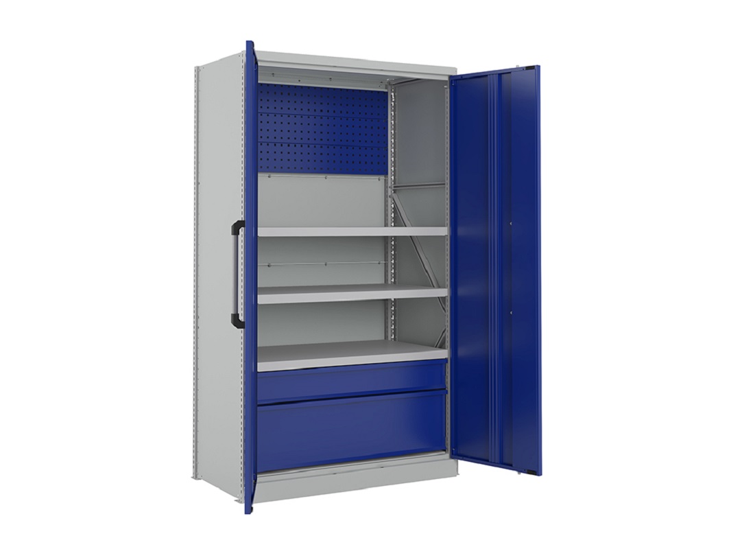 Выдвижной ящик также рассчитан на нагрузку до 95 кг. Помимо него, в шкафу предусмотрен экран для удобного размещения небольших инструментов на специальных держателях. Для еще большего удобства предлагаем оснастить шкаф дополнительными полками и ящиками.