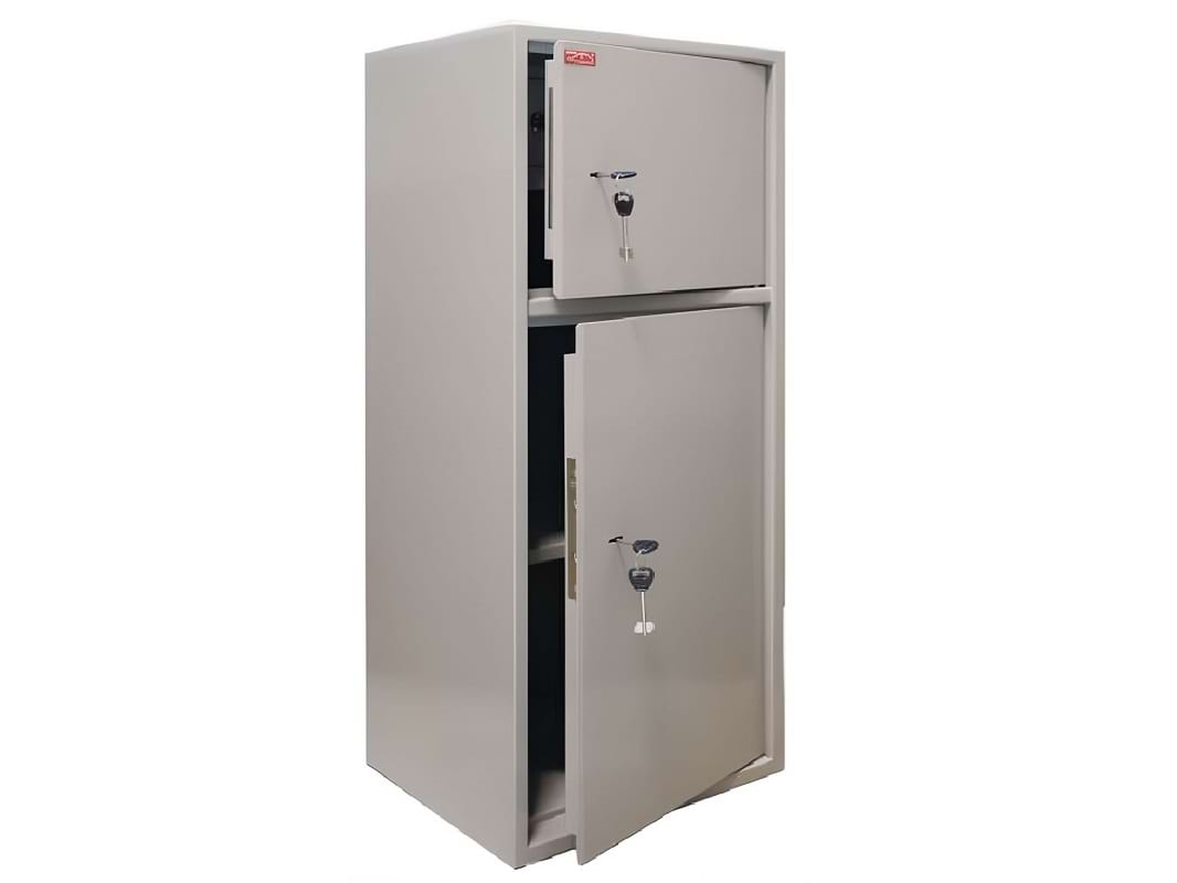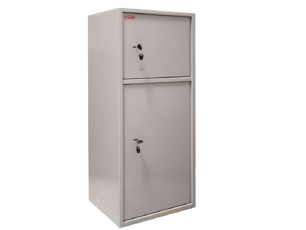 Шкаф разделен на два отсека, каждый из которых закрывается на отдельный замок, обеспечивая дополнительный уровень безопасности. Корпус выполнен в сером цвете и покрыт специальным порошковым составом, который надежно защищает металл от коррозии.