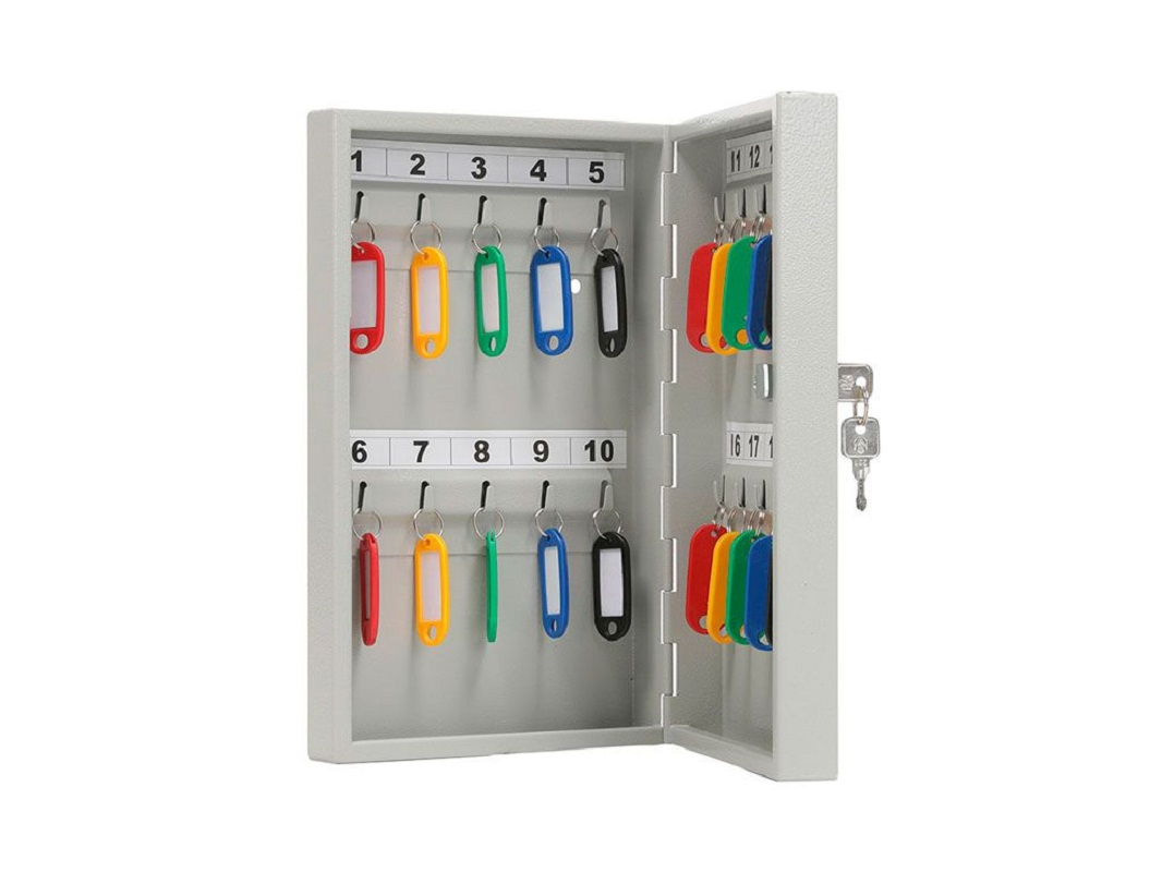 Ключница – это специализированный ящик для хранения ключей. Позволяет объединять и фиксировать все ключи в одном месте, тем самым уменьшает риск их утери и незаконного использования посторонними лицами. Закрывается на замок. Самый распространенный вариант исполнения – металлическая ключница. Размещается стационарно на стене, в корпусе предусмотрены отверстия для крепления. Окрашивание – полимерное. Данная модель имеет 20 крючков для навешивания ключей. Также в комплект входят пластиковые цветные брелоки, рассчитанные на количество ключей. Ключницы используют на предприятиях, в гостиницах, санаториях, общежитиях, в офисах, на контрольно-пропускных пунктах, в многоквартирных домах на посту консьержа и других помещениях.