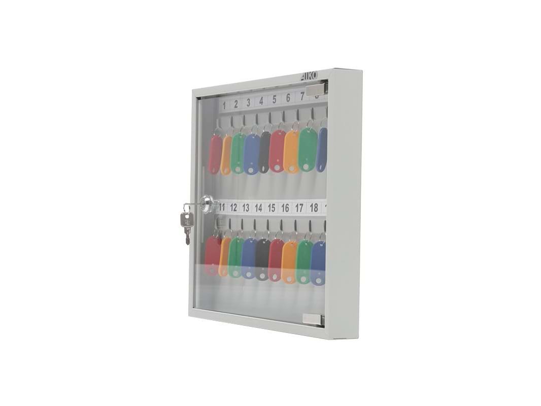 Ключница KEY-G выделяется среди других моделей своей стеклянной дверцей. Она изготовлена из высококачественной стали толщиной 0,9 мм. Внутри находятся специальные крючки для удобного хранения ключей. Для крепления на стене в корпусе предусмотрены отверстия.