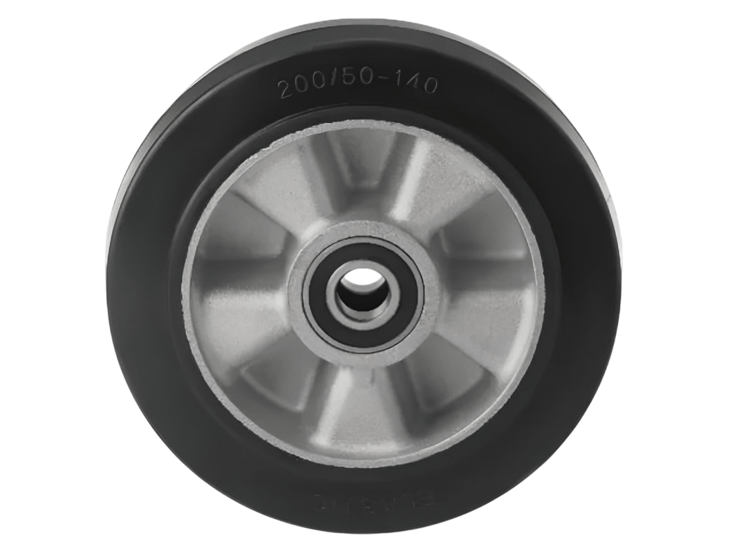 Диаметр колеса увеличен до 200 мм, а один из подшипников специально углублен внутрь, что делает его установку на тележку более удобной. Контактный слой выполнен из резины — прочного материала, который может использоваться на полах с любым покрытием. Благодаря высокой износостойкости, резина не оставляет следов на поверхности.