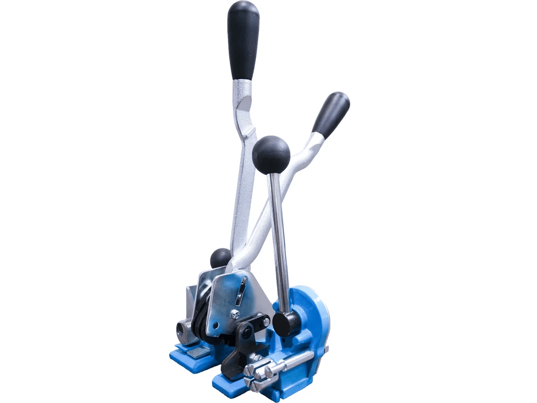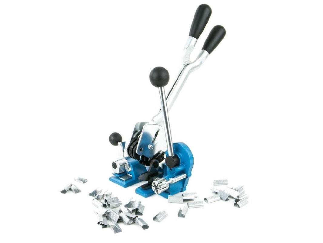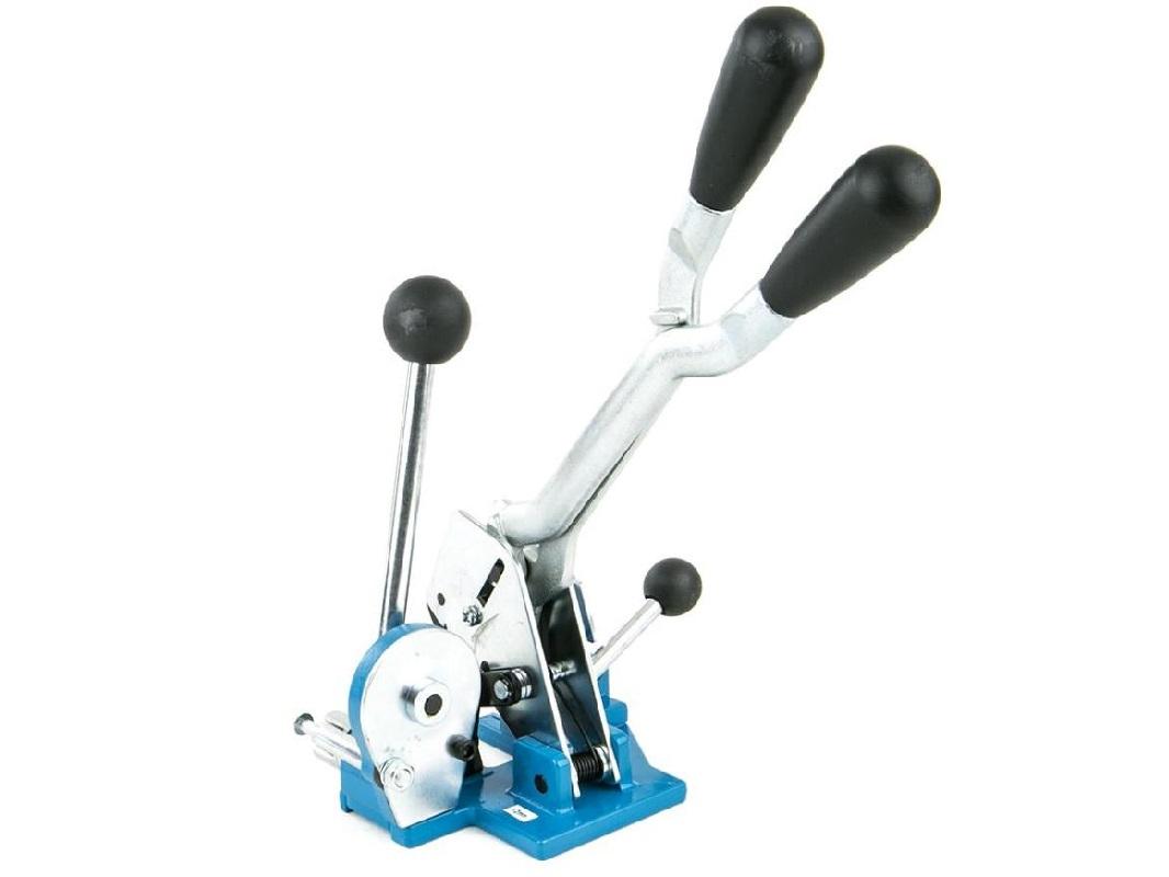 Считается самым эффективным устройством для работы, но не всегда удобным в применении. С помощью такого инструмента возможно сгруппировать несколько объектов вместе, например коробки, доски или закрепить груз на поддоне. Заменяет сразу два инструмента, натяжитель и пломбиратор, что позволяет сэкономить время при работе.