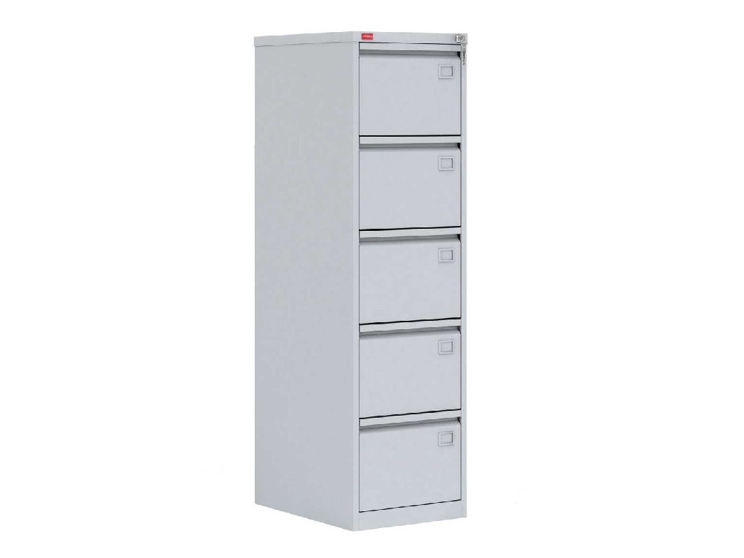 Картотечный металлический шкаф для хранения документов КР-5 используется для упорядоченного хранения документов различных форматов (А4, А5), а также чертежей (А1, А0). Можно размещать отдельными файлами, сшитыми, в папках, скоросшивателях или вертикально. Они спроектированы так, что можно расположить большое число бумаг и при необходимости найти нужный документ за счет систематизированного хранения. Зачастую имеют центральный замок. Уже давно, наравне с деревянными шкафами, можно встретить металлические. Пять больших выдвижных ящиков с большой грузоподъемностью до 30 килограмм. Общий вес не более 68 кг., дополнительно можно установить систему антиопрокидывания.