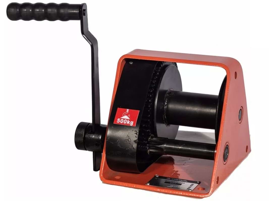 Такая модель отличается от прошлых наличием автоматического стопорного механизма. Считается уже промышленной моделью, тип передачи червячный. Такой тип передачи является более надежным и неприхотливым в использовании. Оборудование рассчитано на работу на улице с температурами от -20 до +40 С и относительной влажностью не более 85%. Повышенная емкость каната до 35 метров, в комплект не входит. Максимальная скорость навивки каната 1 метр в минуту, не пытайтесь увеличить скорость каким-то дополнительным оборудованием, это небезопасно. Лебедка управляется вручную с помощью рукоятки, которая совершает круговые движения.