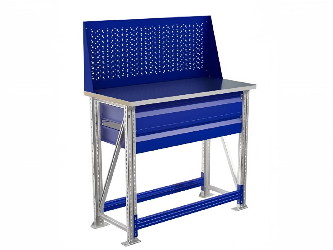 Зачастую это перфорированный экран (плоскость, на которую крепят крючки и держатели для инструментов), комплект освещения, упоры, тиски, полки и ящики. При желании клиента можно полностью собрать необходимую подборку из тумб (имеются как с дверцами, так и с выдвижными полками), столешниц (параметры разнообразные, подбирают под требования специалиста, типовые: высота — 80–90 см, ширина — 80–100 см, длина также подбирается индивидуально).