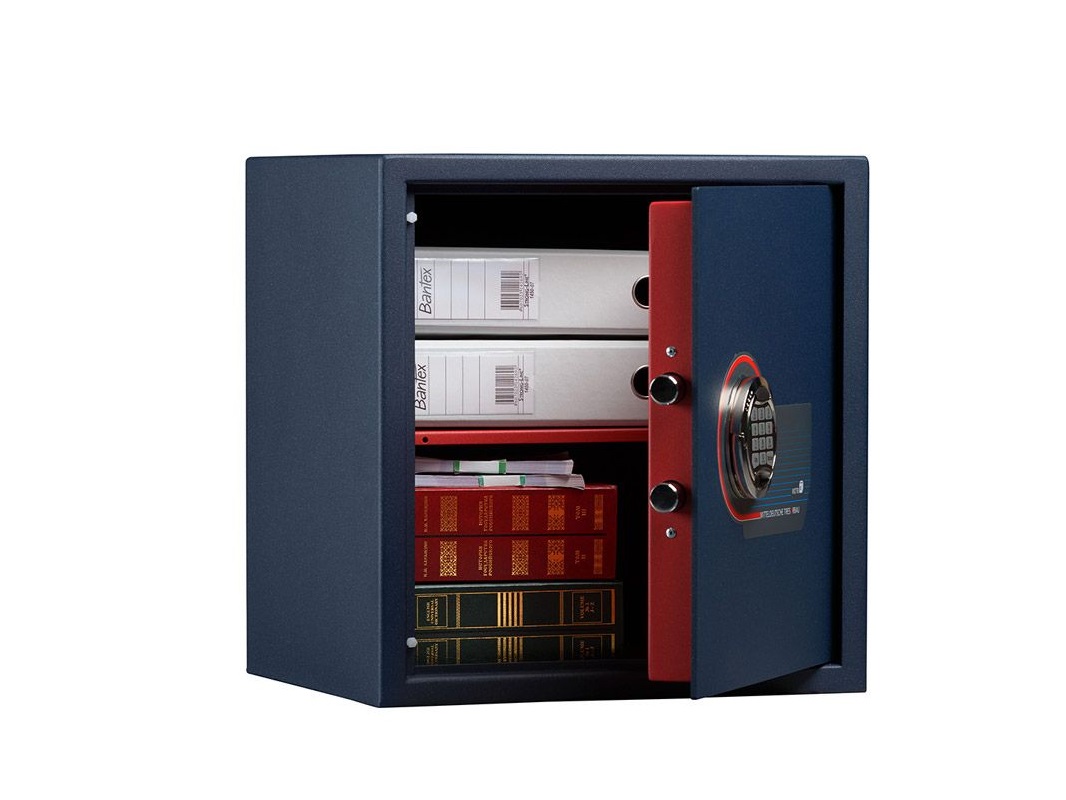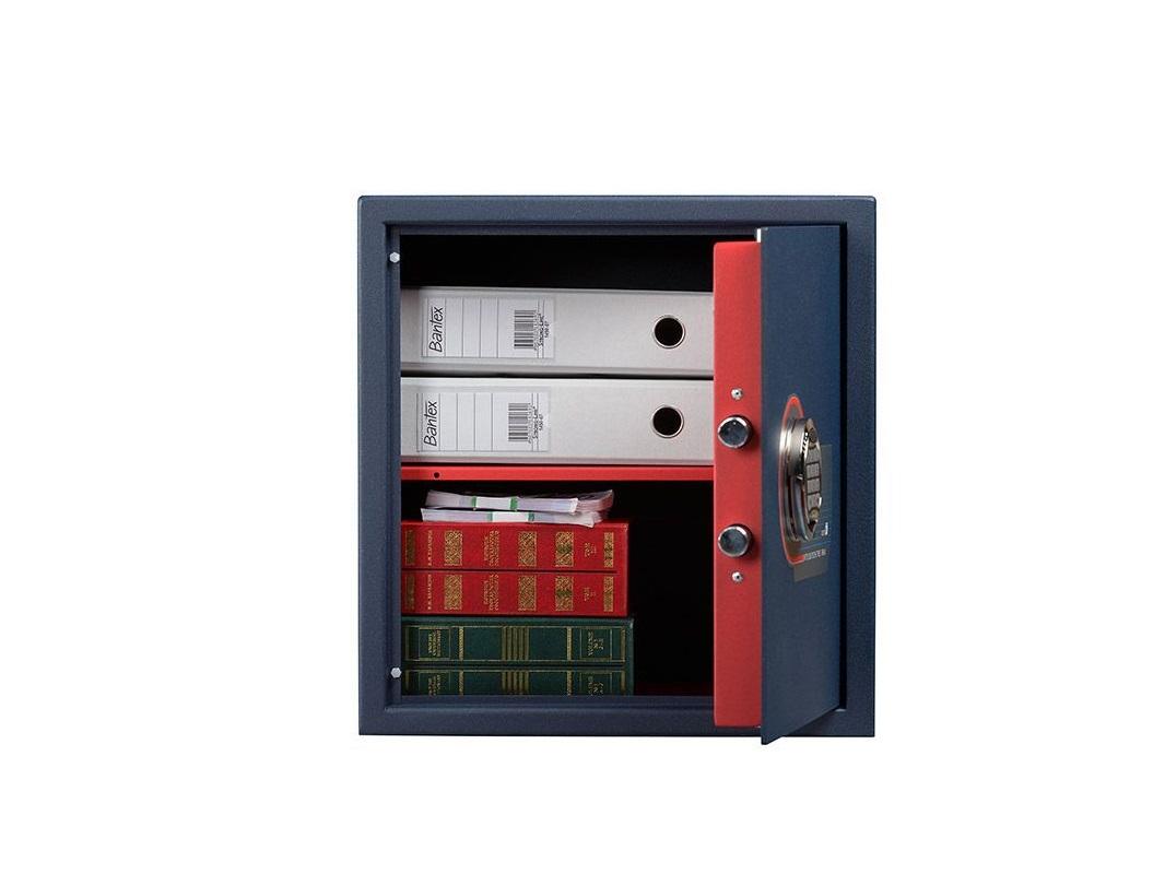 Дизайн сейфа привлекает внимание. Внешняя сторона окрашена в синий цвет, а внутренняя — в красный. Порошковое покрытие защищает сейф от бытовых повреждений, отталкивает пыль и предотвращает коррозию.