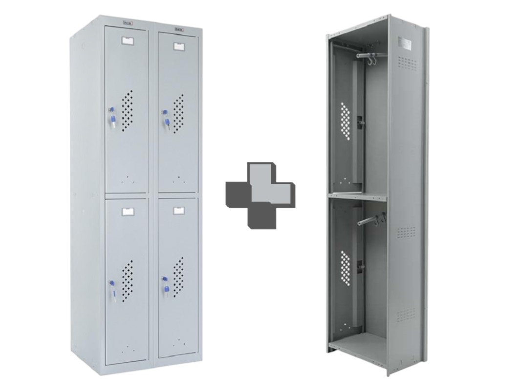 Промежуточная секция устанавливается к шкафу, не имеет боковую стенку, что немного уменьшает стоимость по сравнению с трехсекционным шкафом. Отличительной чертой является разделение шкафа на секции, всего 6 секций каждая шириной 300 мм и высотой 900 мм. Позволяет разделить зоны хранения на большее количество человек. Зачастую такие комбинации используются в раздевалках, где нет верхней одежды.