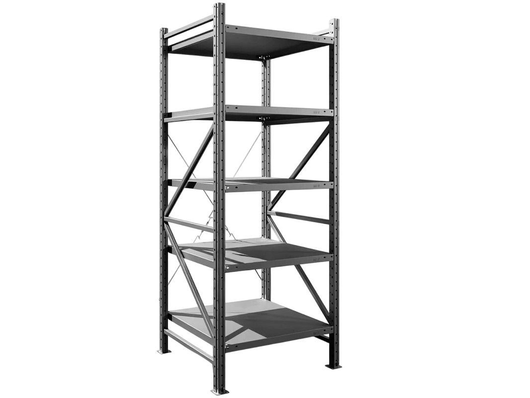 Стеллаж с небольшой длиной и шириной полки, для увеличения грузоподъёмности устанавливаются ребра жесткости.