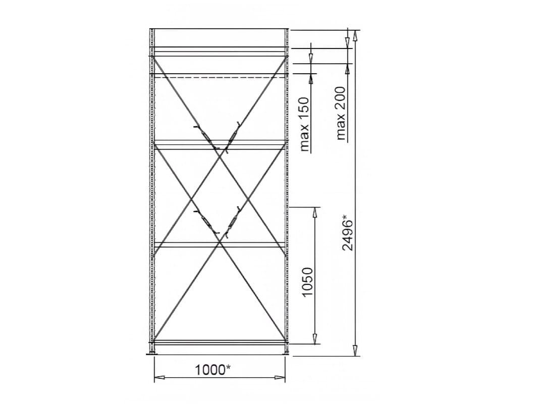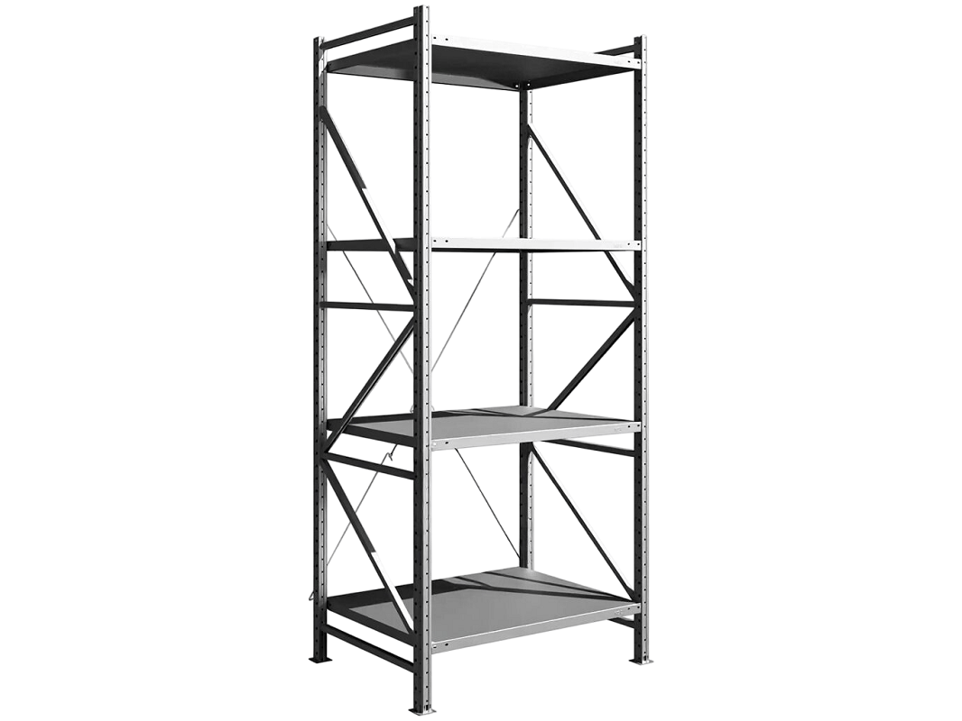 Стеллаж среднегрузовой MS U с высотой 2500 мм и полкой длиной 1000 мм. Глубина стеллажа 800 мм с максимальной нагрузкой на уровень не более 300 килограмм. Максимальная нагрузка на всю секцию не более 1000 килограмм, при использовании дополнительных комплектов раскосов максимальная нагрузка на одиночную секцию увеличивается до 2000 килограмм. Для такой серии стеллажей минимальное количество полок с высотой до 2 метров составляет 3 штуки, с высотой более 2 метров минимальное количество полок 5 штуки. Допускается установка нижнего яруса не выше 130 мм от пола, с максимальным расстоянием между полками не более 700 мм. Для обеспечения устойчивости стеллаж необходимо крепить к полу с помощью анкерных болтов, минимальная длина должна 100 мм.