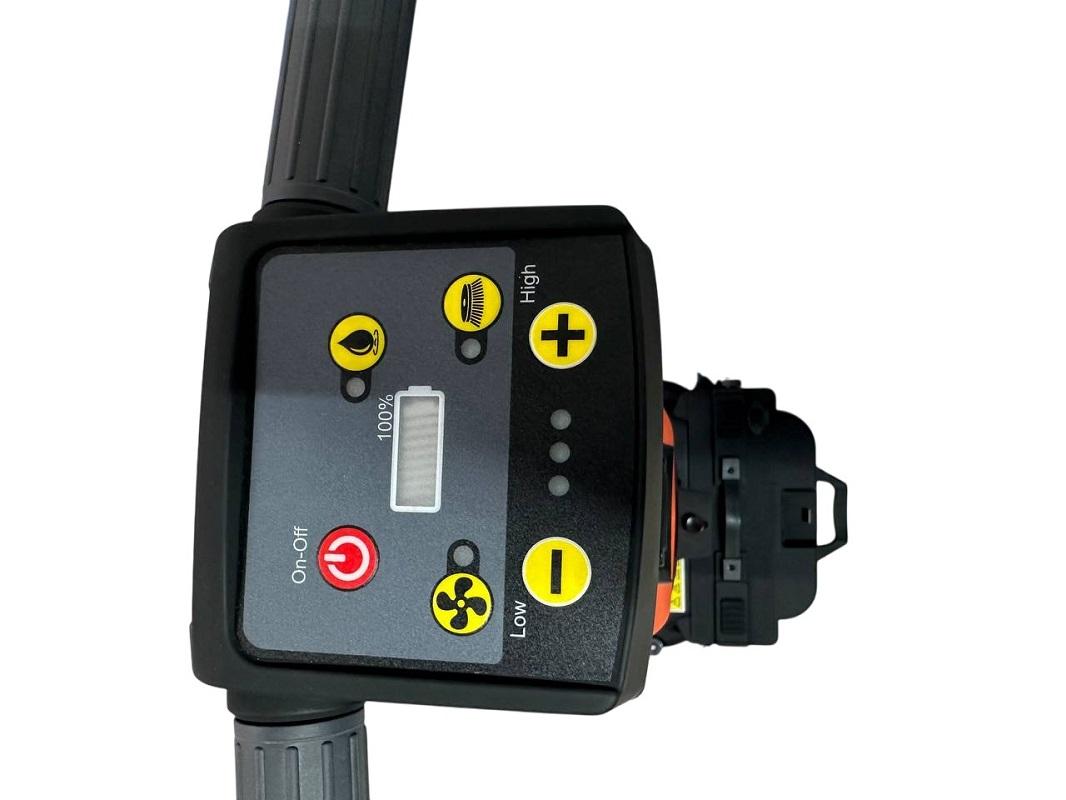 В комплект входят две дисковые щетки шириной 212 мм каждая, параболическая всасывающая балка 450 мм и быстросъемные литиевые аккумуляторы, обеспечивающие до 1,5 часов работы без подзарядки. Для удобства зарядки предусмотрено зарядное устройство. Машина оснащена раздельными отсеками для воды объемом 4 и 6 литров, которые легко наполнять и опустошать. Складная ручка экономит место при хранении и транспортировке.
