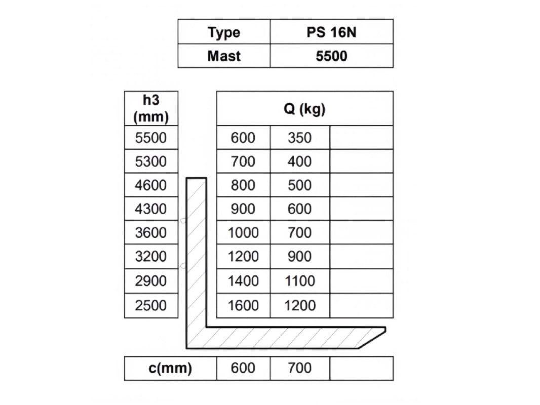 Данная модель имеет больше вариантов доступных мачт, чем линейка штабелеров с грузоподъёмностью 1600 кг. При выборе высоты подъёма обратите внимание на габариты мачты в сложенном положении и ширину прохода.