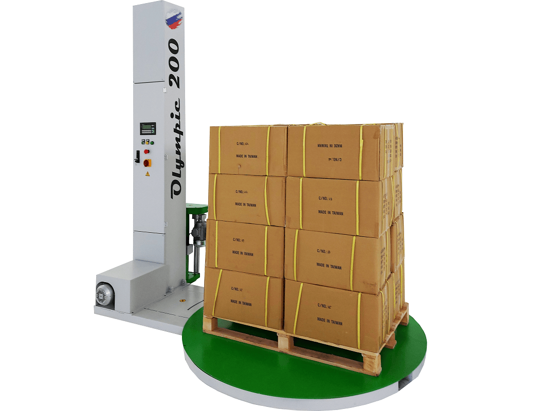 Olympic 200 — это полуавтоматическая машина для обмотки паллет стретч‑плёнкой. Оператор устанавливает паллет на платформу, закрепляет конец плёнки и запускает цикл упаковки; далее аппарат самостоятельно выполняет обмотку по заданной программе. По завершении цикла оператор отрезает плёнку и снимает готовый паллет.