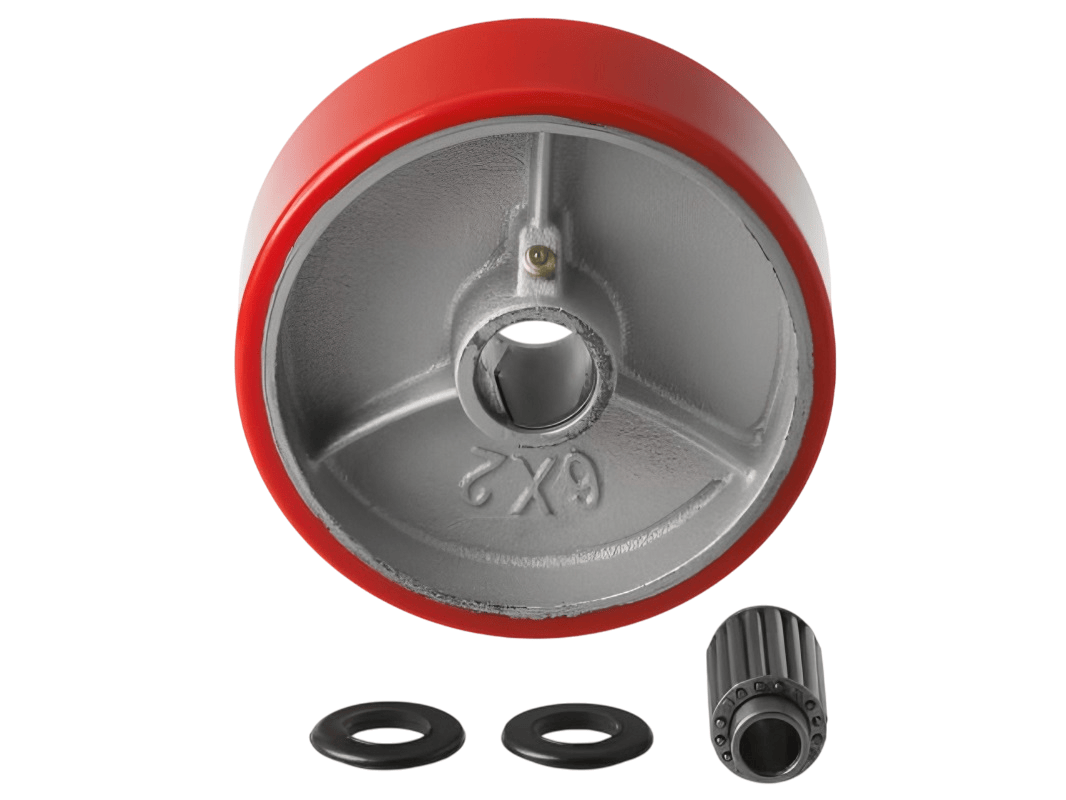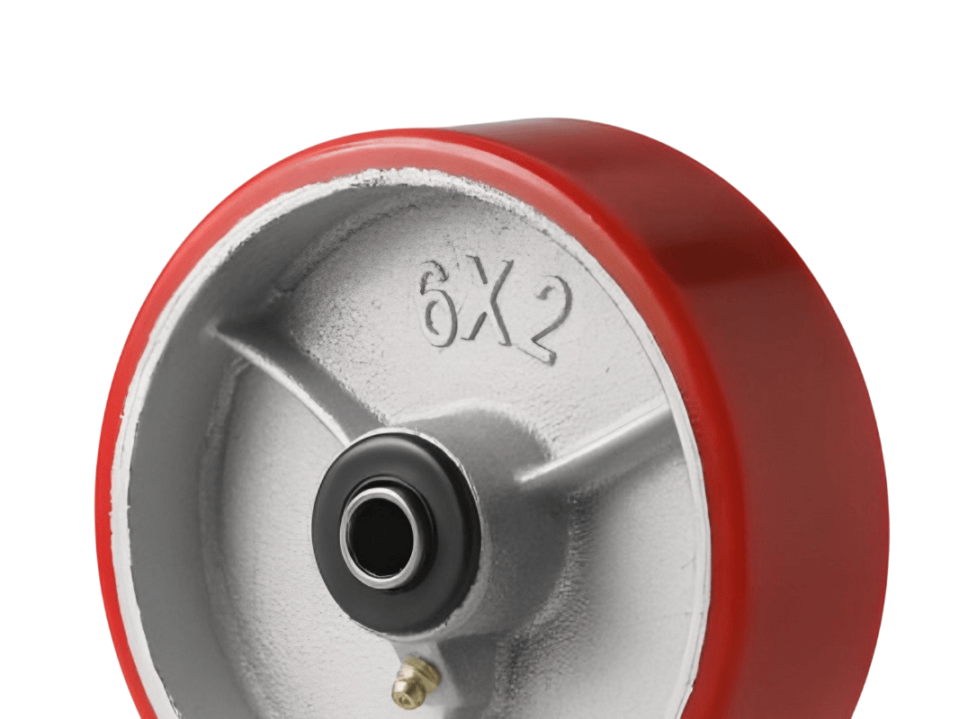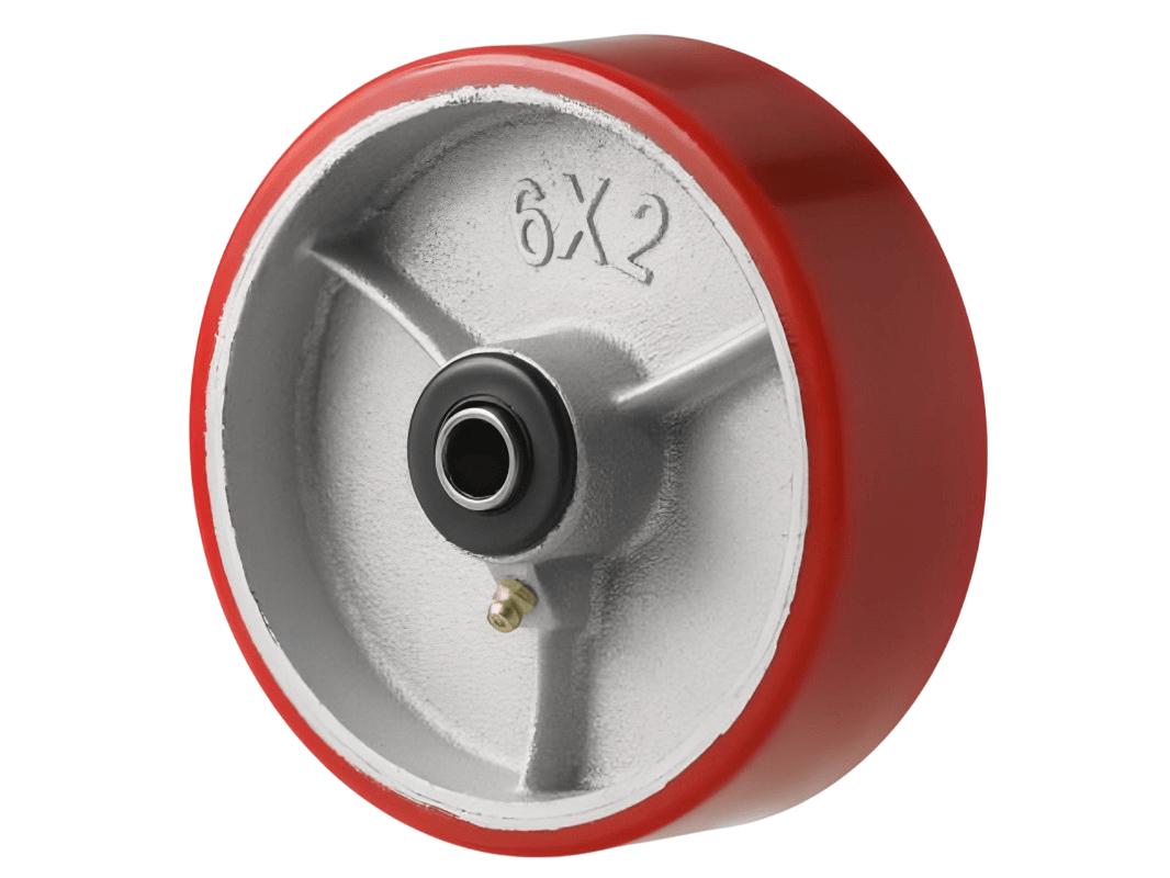 Колеса изготовлены из полиуретана, который надёжно соединён с чугунным ободом методом вулканизации. Это исключает риск отслоения шины. Обод оснащён дополнительными рёбрами жёсткости, а в оси установлен роликовый подшипник в стальной обойме. Колесо легко вращается, но при этом устойчиво к боковым и ударным нагрузкам.