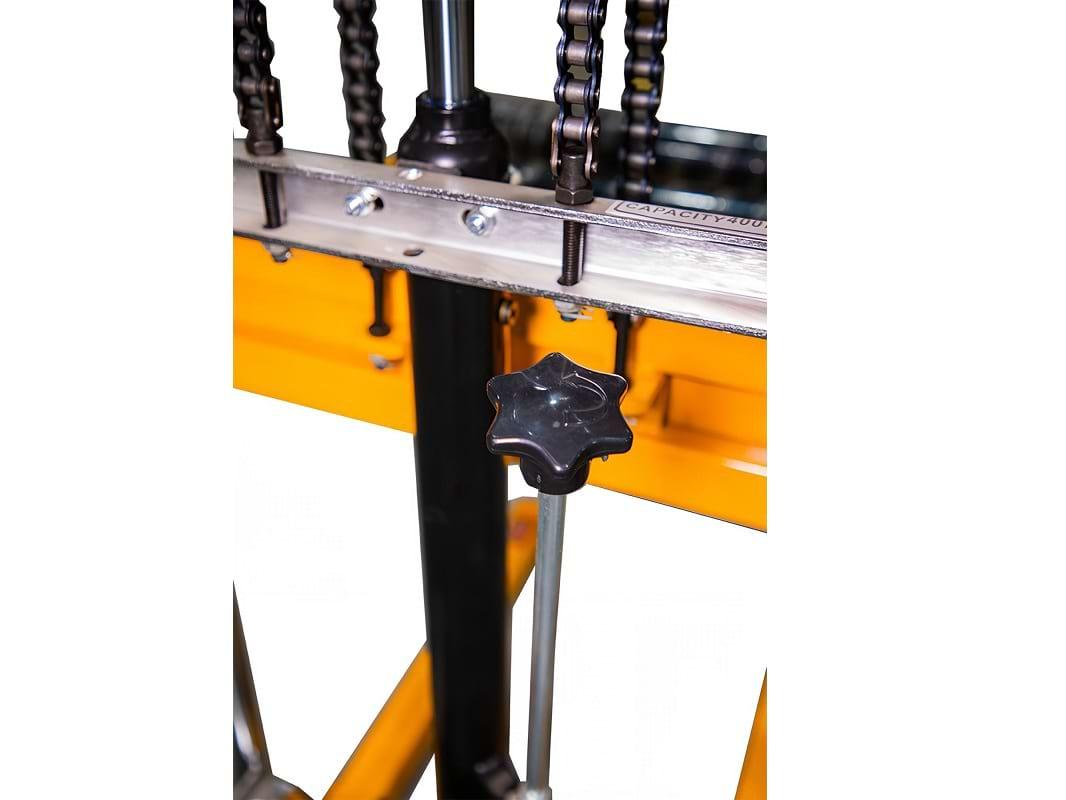 Благодаря небольшой высоте и четырем опорам, штабелер отличается повышенной устойчивостью. Он оснащен двумя опорными колесами большого диаметра — 125х150 мм, а также двумя роликами диаметром 78 мм, что позволяет ему заезжать под поддон для более удобного хранения. Колеса изготовлены из высококачественного материала, обладающего повышенной износостойкостью и высокой грузоподъемностью.