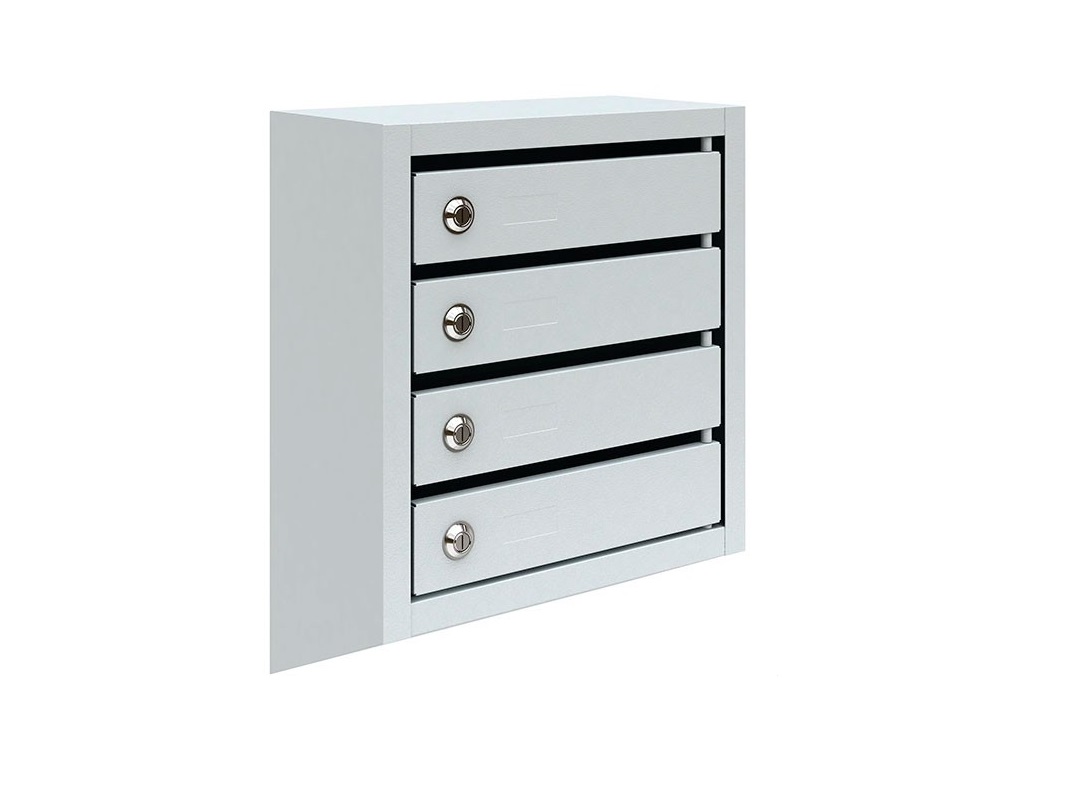Ящик имеет четыре секции, расположенных по вертикали. Каждая оснащена индивидуальным врезным замком, который идет в комплекте. Также оборудован фиксатором дверей для защиты от несанкционированного вскрытия. При необходимости дверцу можно легко заменить или отремонтировать.