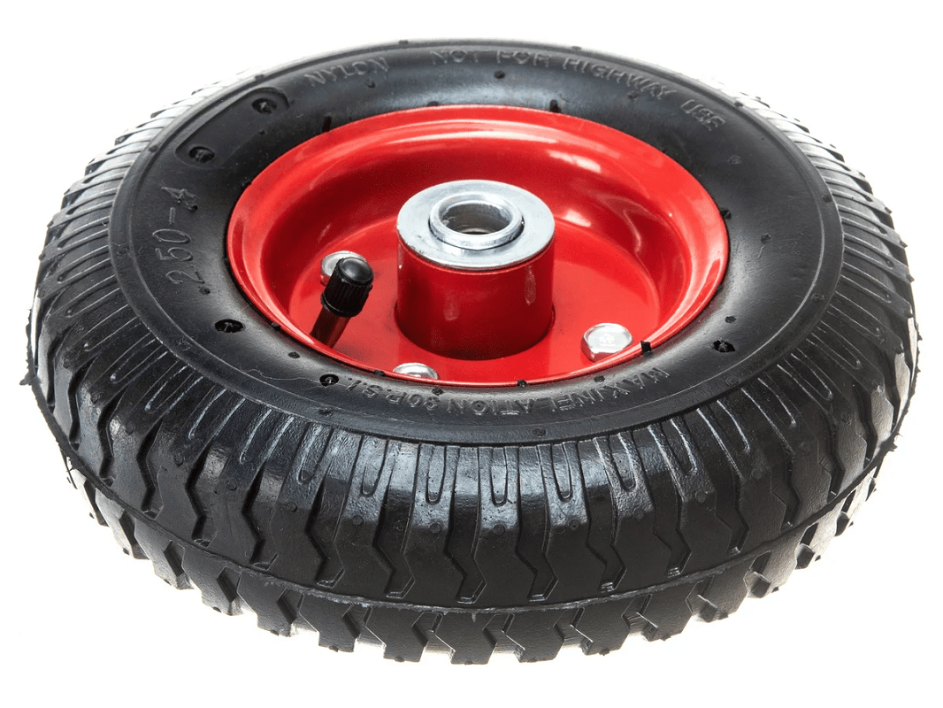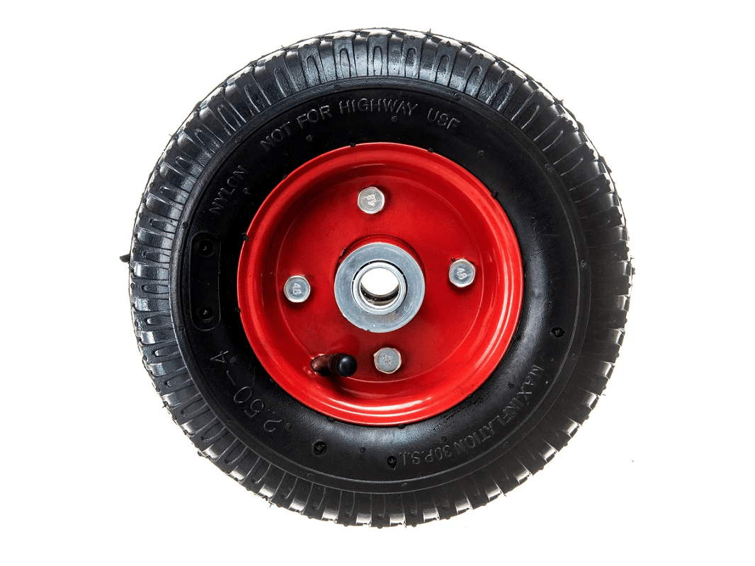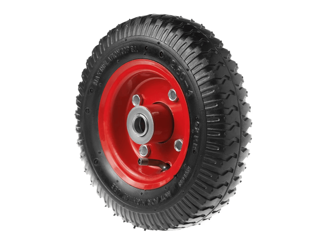 Пневматическое колесо 2.50-4 с симметричной ступицей, металлическим ободом и шариковым подшипником, осью 16 мм PR 1400-16 (210 мм/180 кг), отличается простотой установки и ремонта, что делает его востребованным.