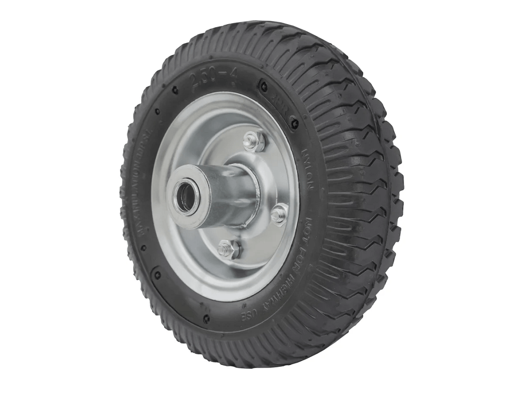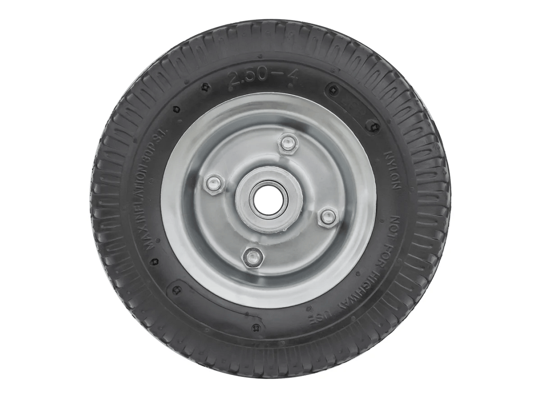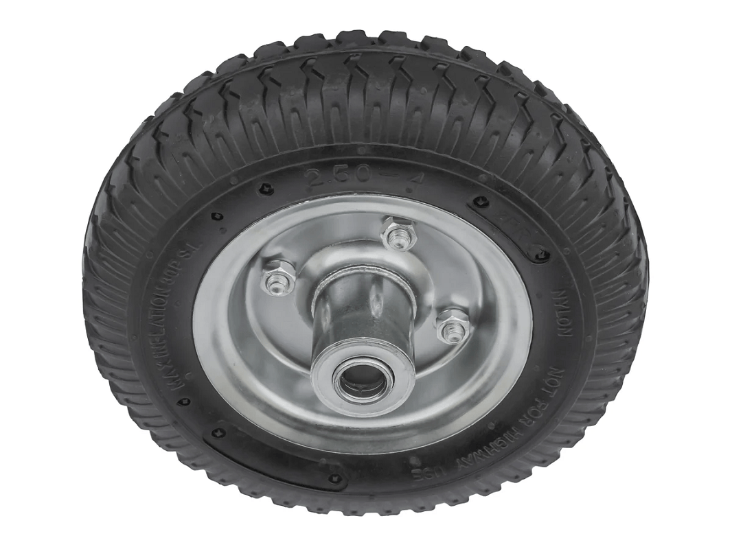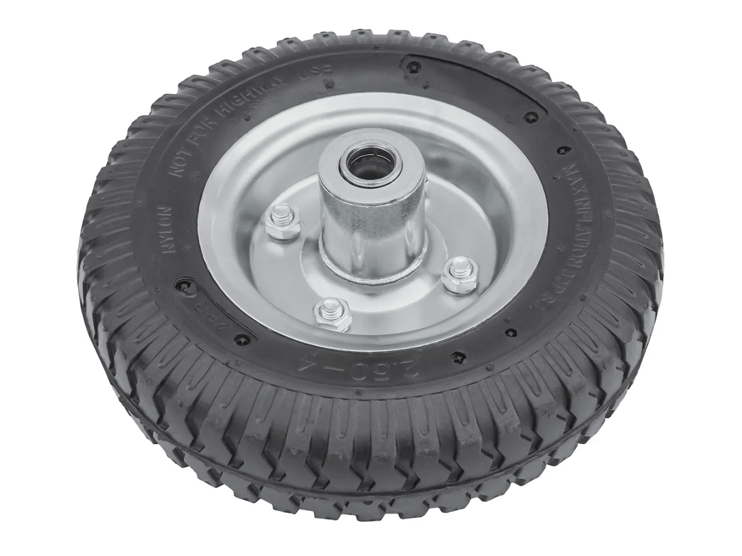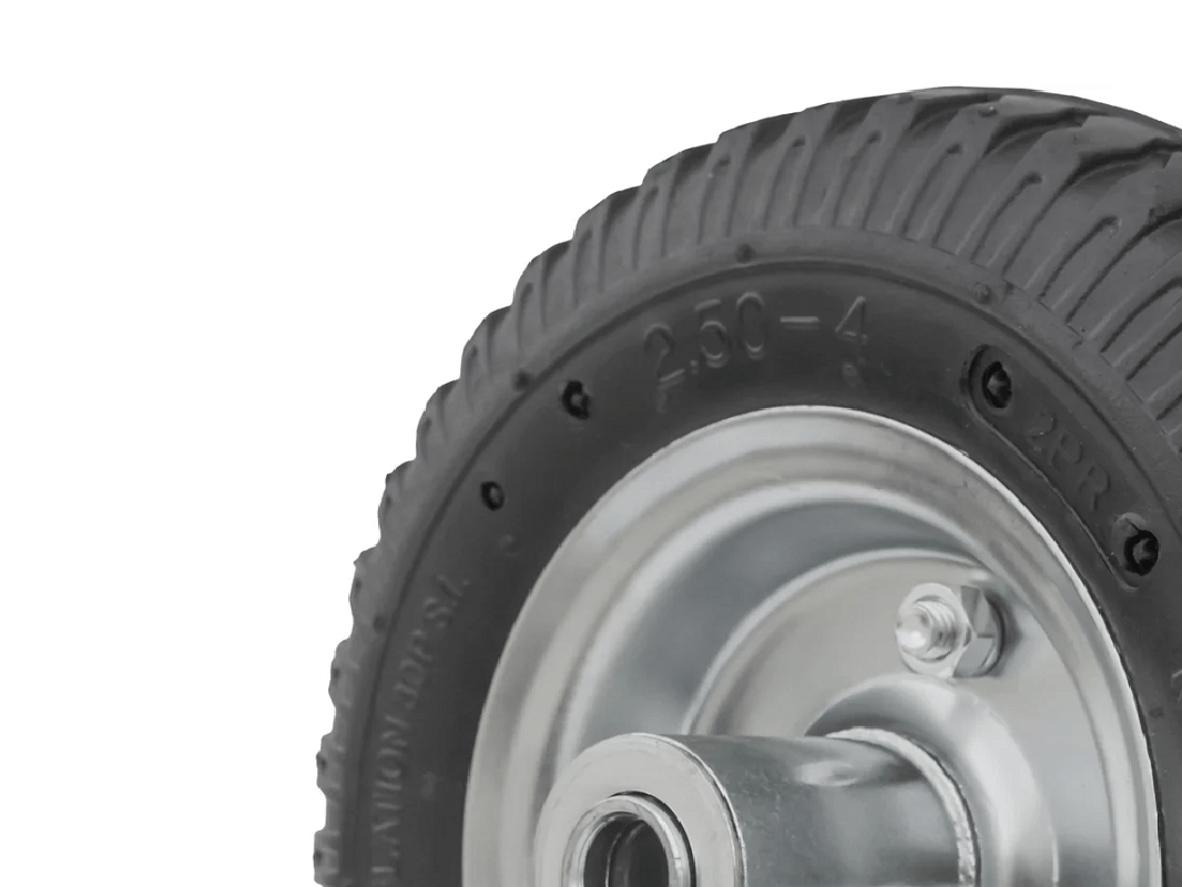 Колесо пневматическое 2.50-4 с несимметричной ступицей, металлическим ободом и шариковым подшипником, ось 16 мм, PR 1400-16n (210 мм/100 кг) предназначены для садовых и строительных тачек, а также для четырёхколёсных тележек с поворотной осью, рассчитанных на использование в различных условиях, включая уличные.