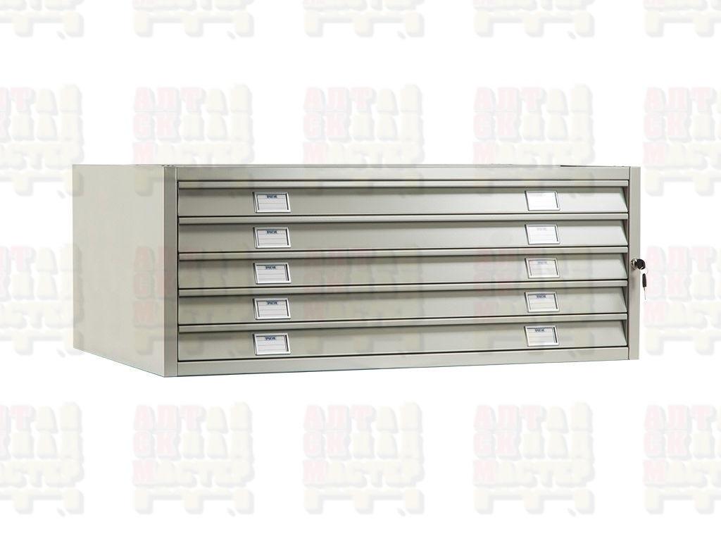 Такие картотеки используют для хранения документов формата А0. Широкий шкаф отлично подходит для складирования геологоразведочных карт, планов и конструкторских чертежей и т. д. Укомплектован пятью выдвижными ящиками с системой полного выдвижения. Каждый ящик установлен на телескопические направляющие, которые обеспечивают свободный и плавный ход даже при полной загрузке. Максимально допустимая нагрузка 20 килограмм. Такая картотека является сборной, сюда можно добавить промежуточную секцию, которая увеличит количество промежуточных секций до 15 ящиков.